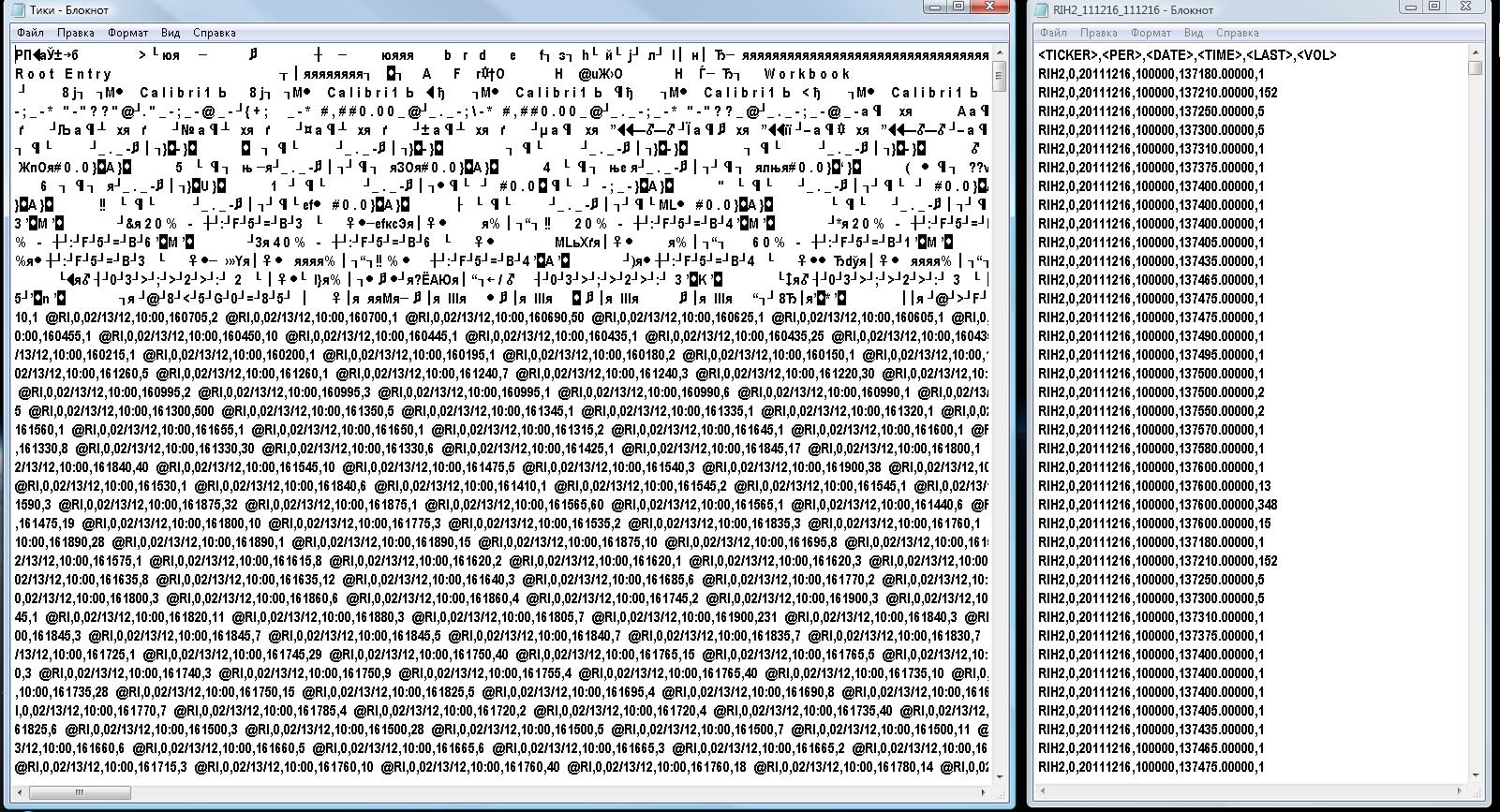 Вложил кусок тиковой истории. Сохранил в экселе, т.к. в блокноте он не открывается, вероятно, из-за размера. :))))