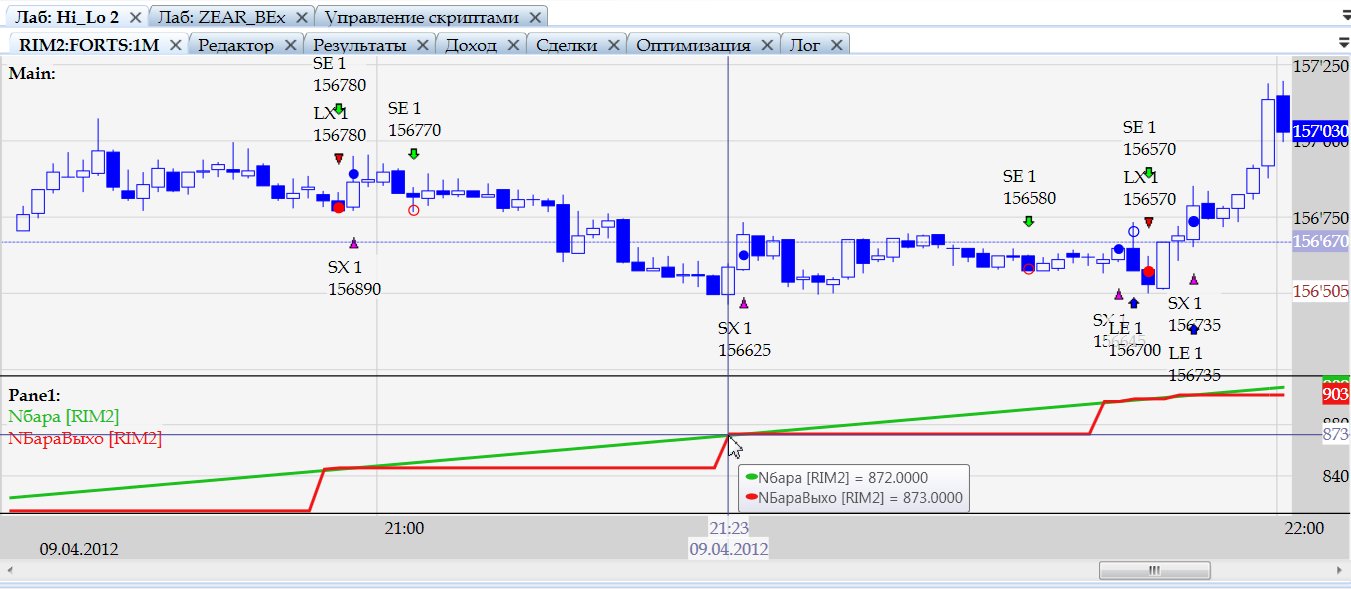 Ошибка, я думаю, в том, что из текущего № бара вычитается № бара выхода, а "бар выхода" начинает выдавать сигнал не на фактической свече выхода, а на предыдущей (там где и появляется сигнал на выход). Поэтому и получается -1. У тех, кто использует эти параметры могут быть ошибки.