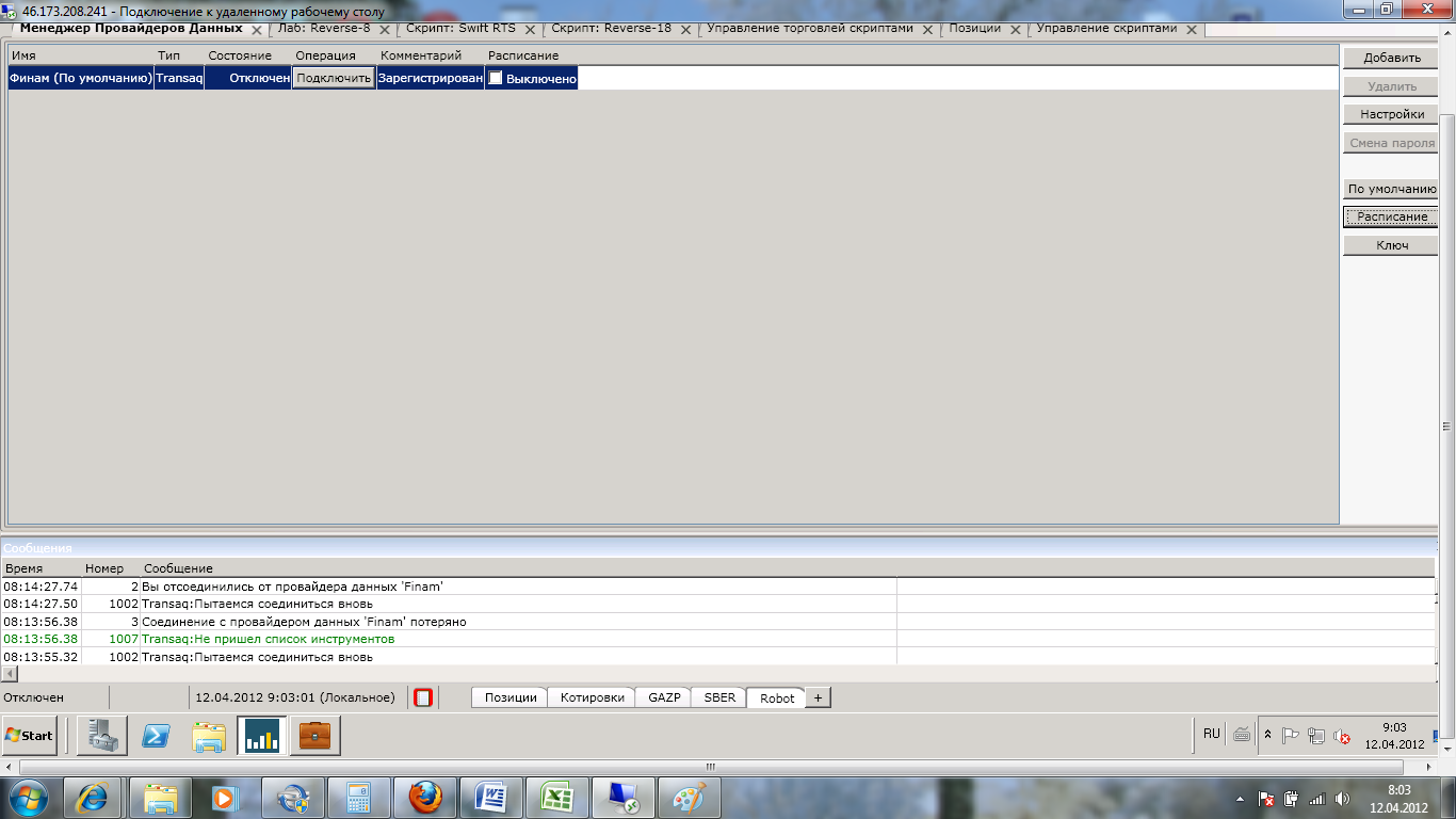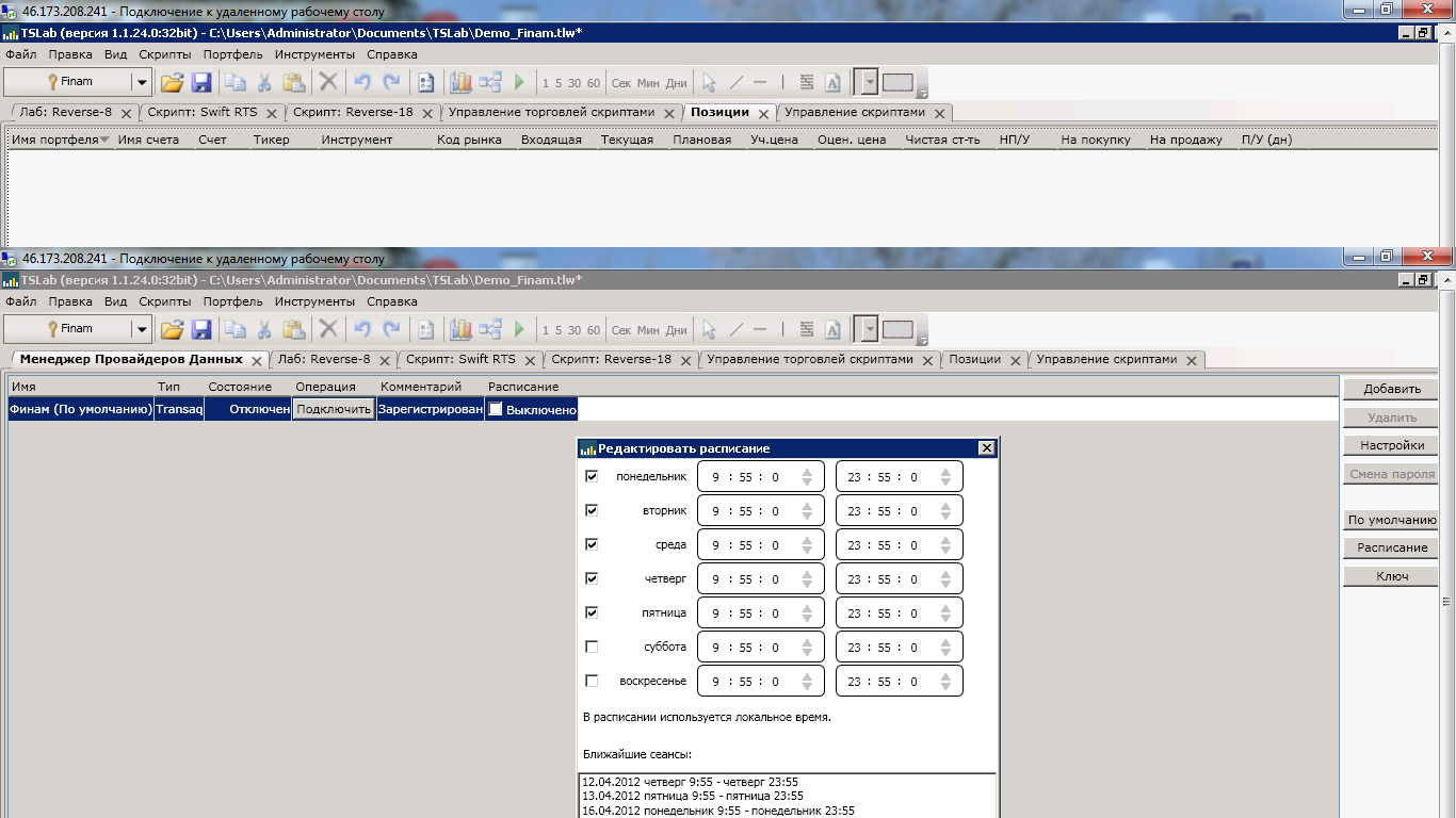 Подскажите, пожалуйста, как сделать, чтобы TSLab сама запускалась утром? Расписание настроил, но, судя по сообщениям в программе, где-то в 7:30 она рассоединяется с ФИНАМом (до этого она периодически проверяет поступление данных) и потом сама уже не соединяется. Приходится в 9.55 нажимать кнопку "Подключить".