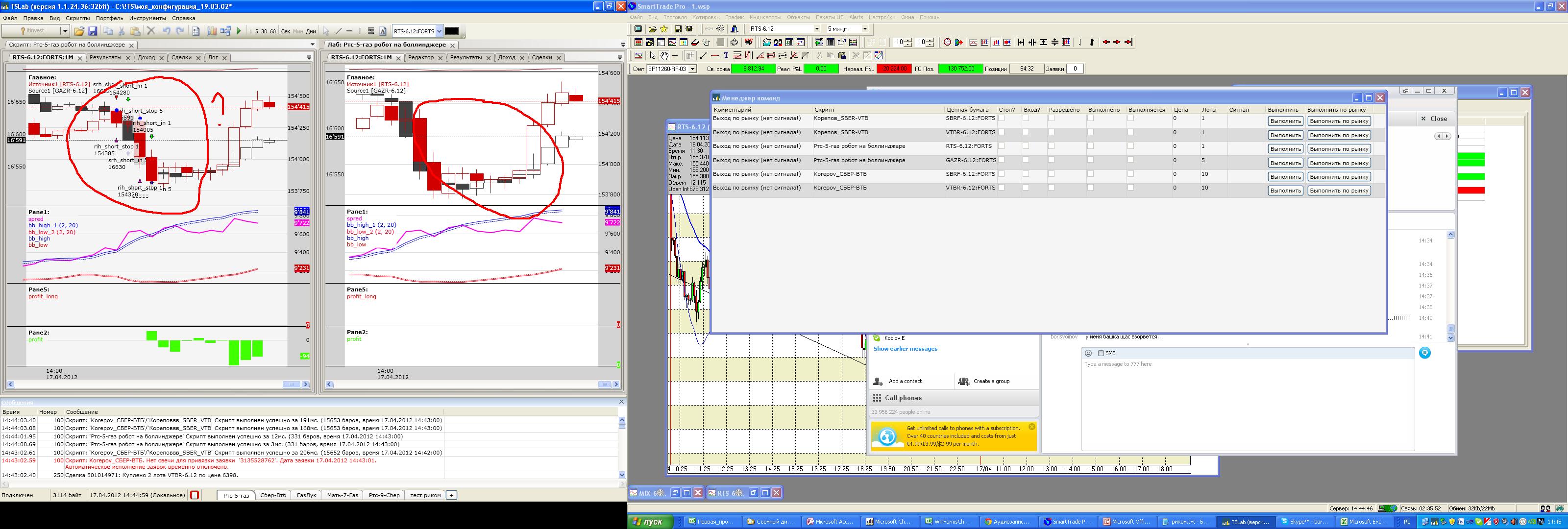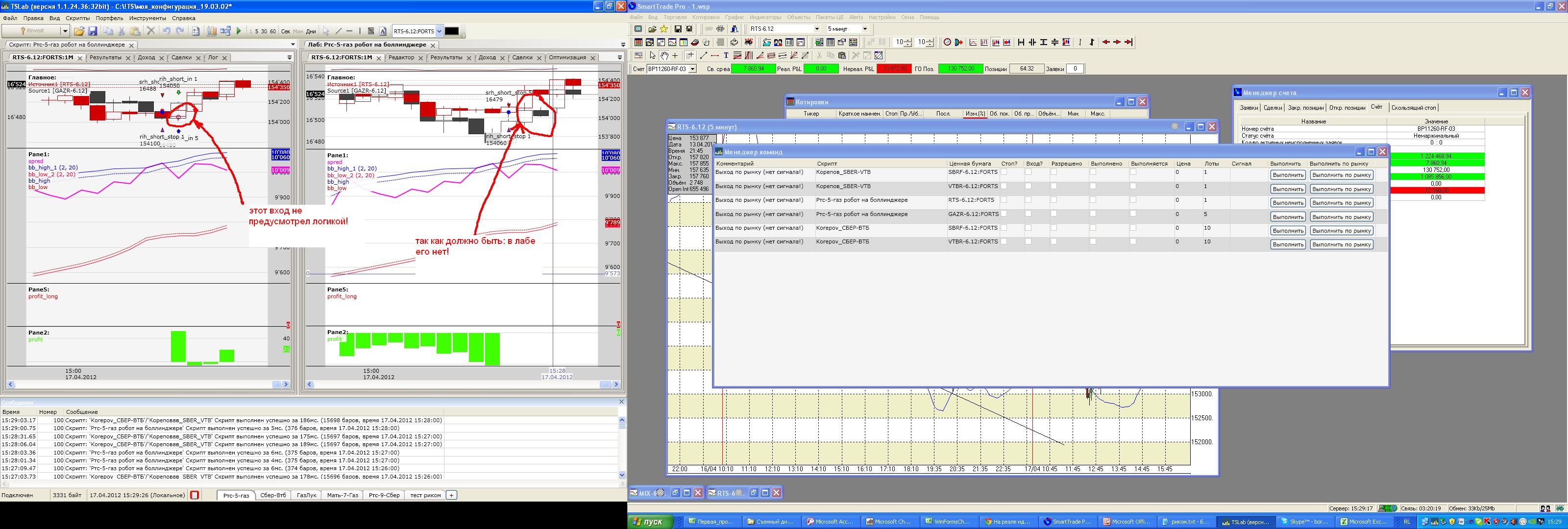 запустил скрипт. картинки не пугайтесь, так все и должно быть. за исключением того, что на реале у меня идут сделки, которых по логике скрипта быть не должно. скрипт в лабе работает правильно - сделок не делает. а, реал напротив - весь покрылся сделками. как быть?