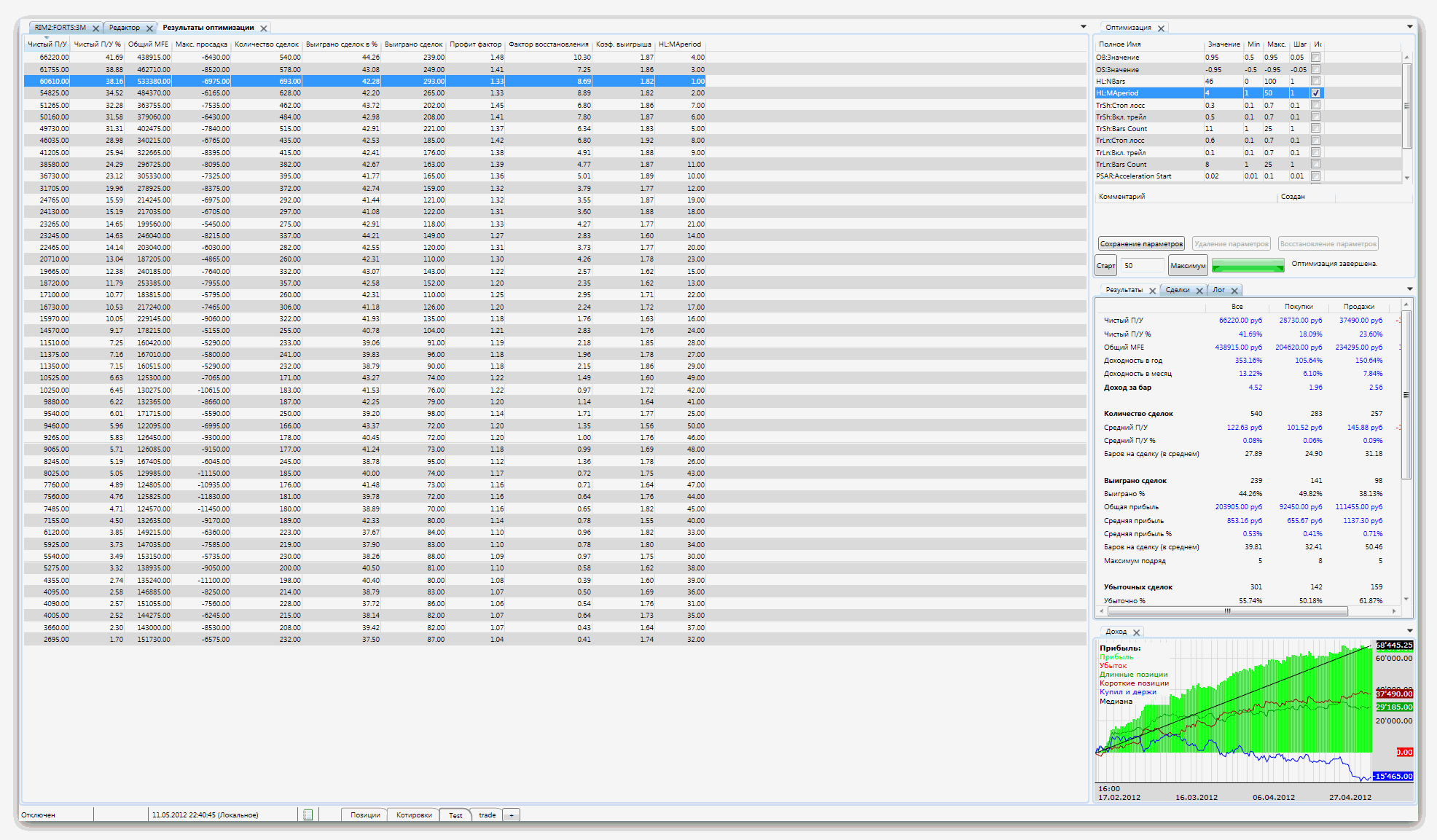 Ещё одно предложение,по-моему реализуемое - после проведения оптимизации и сортировки полученной таблицы по выбранному параметру хорошо бы иметь такую функцию - я последовательно перемещаюсь по строкам таблицы при этом на этом же экране вижу изменение эквити по каждой строке.