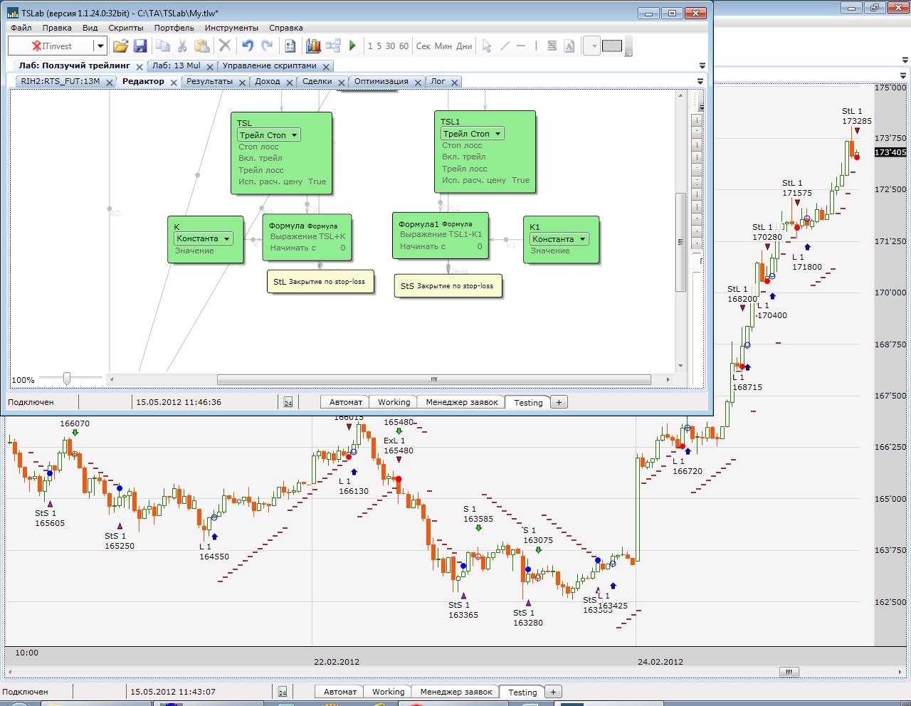 --- в трейл по ATR добавлены 2 параметра - "Шаг стопа" и "Включать шаг после" - позволяют заставить стоп и трейлинг-стоп двигаться на размер шага после указанного количества баров с одинаковым стопом