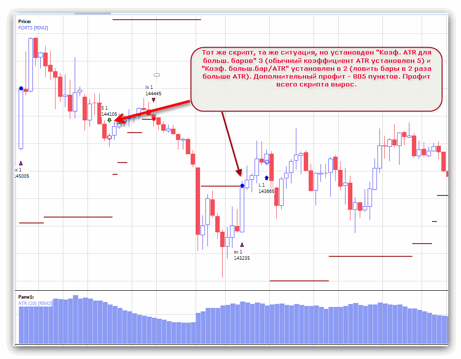 Например, "Коэф. больш.бар/ATR" я выставляю в 3, то есть я хочу оперативно реагировать на свечи, в 3 раза больше ATR, так как после таких свечей высока вероятность отката, а упускать прибыль не хочется. "Коэф.ATR для больш.бара" выставлю в 1.