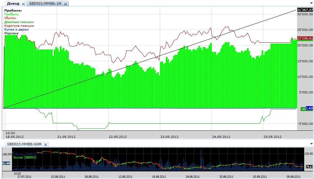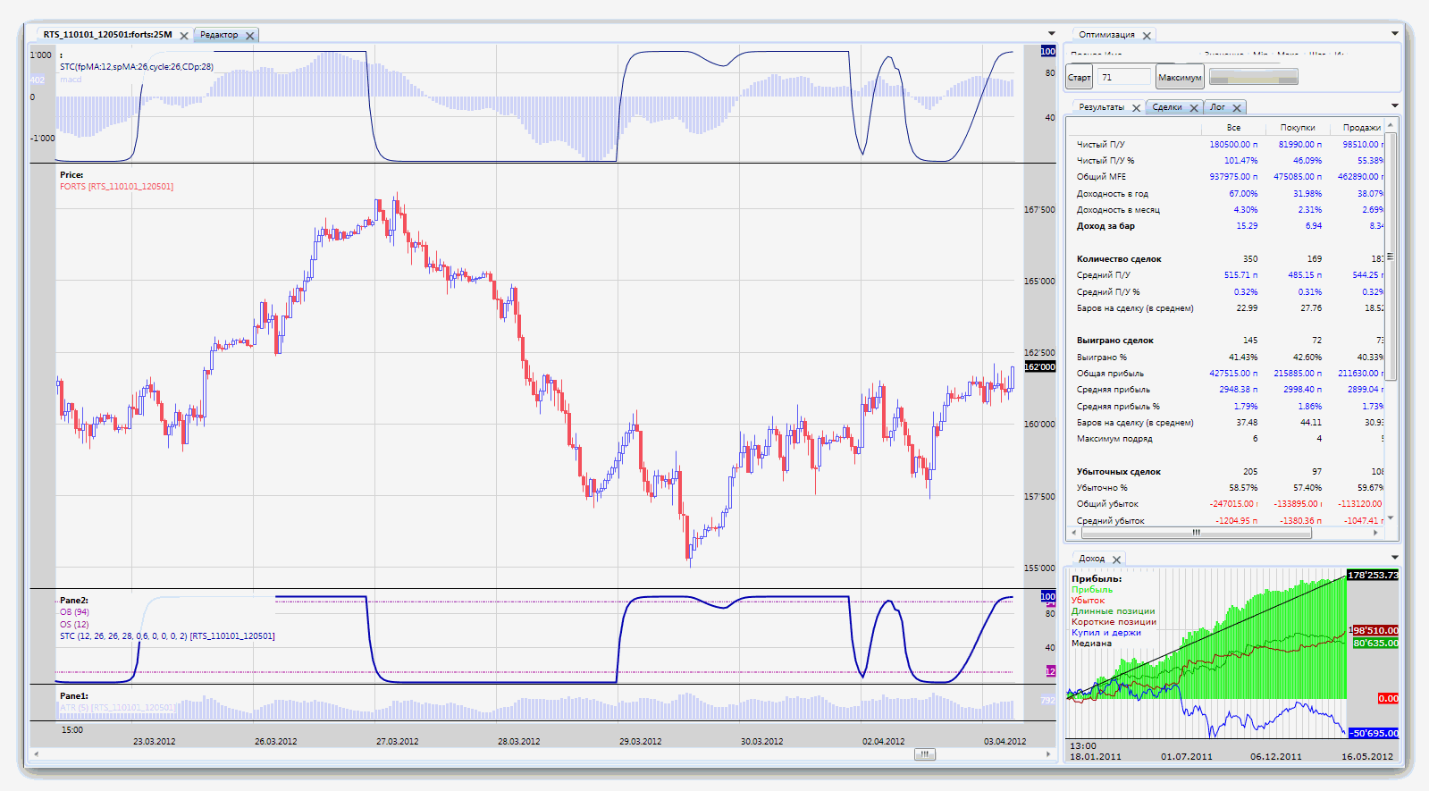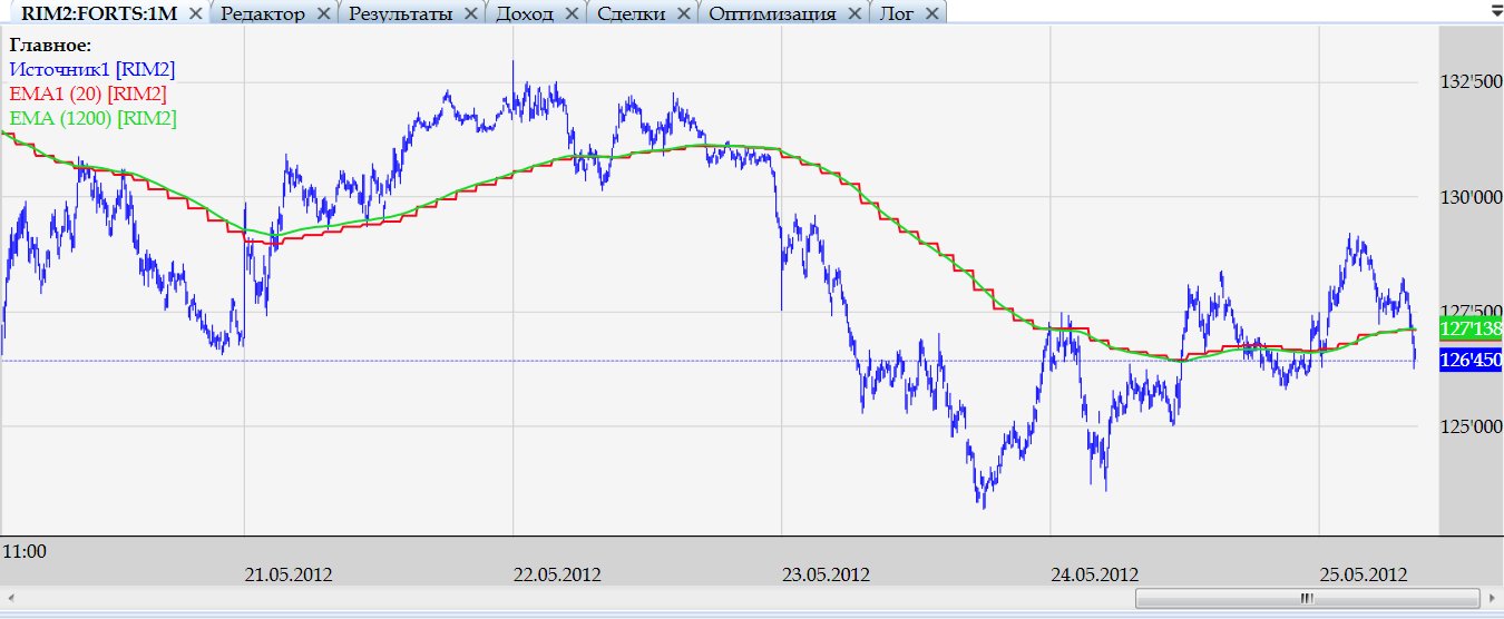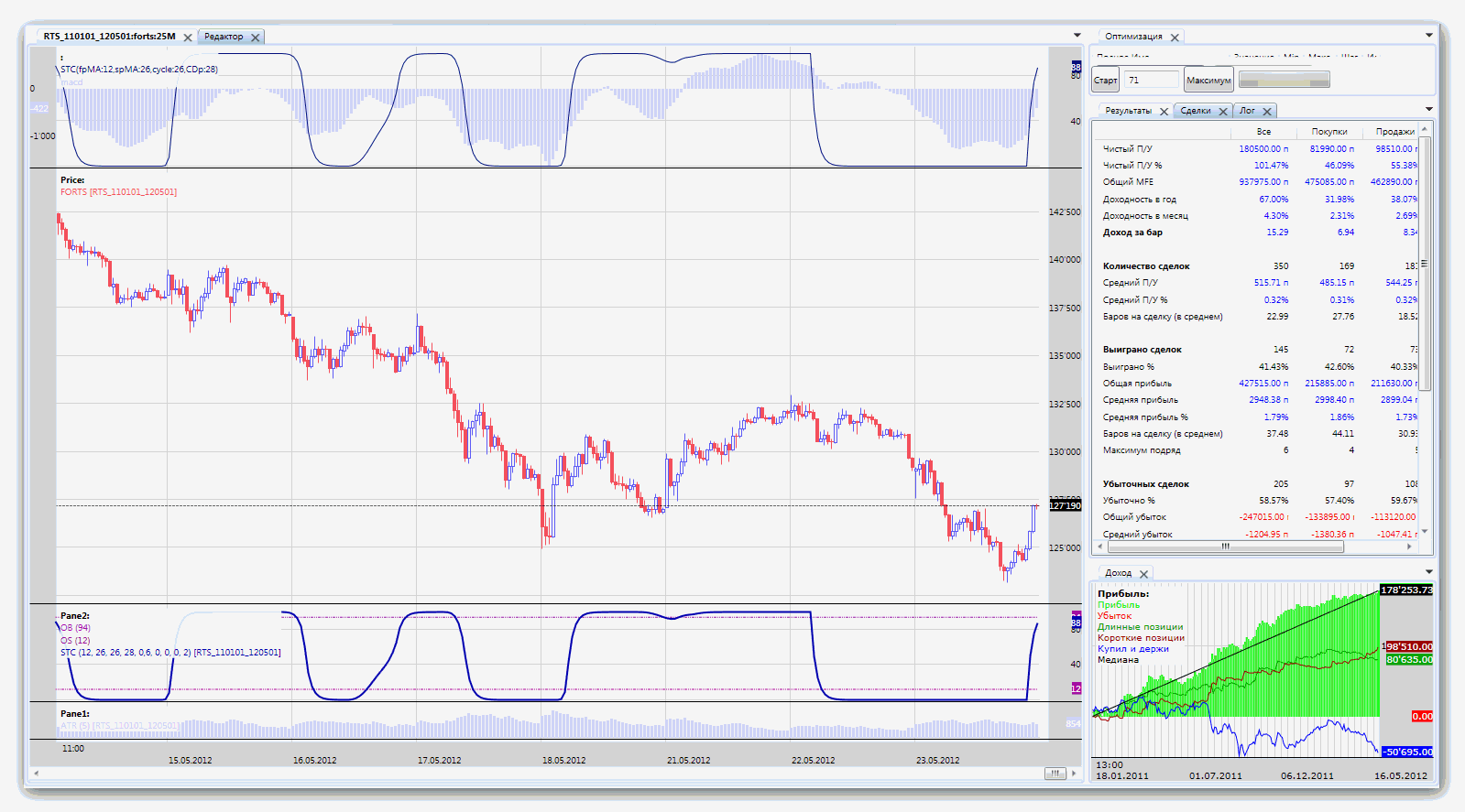 Вот протестил стратегию Schaff Trend Cycle Описание стратегии Вот картинка, разворотная стратегия, но входы видно, а так же видно что входит куда попало и как попало, впрочем как и все "гадалки". Кому надо вот и скрипт этой стратегии. ну так работать с индикатором нельзя! хоть с каким давай вот на SchaffTC чуть подробнее остановлюсь 1. на скринах вижу, что у тебя 3с тики. Если так, то прежде чем с ними работать, нужно их как-то фильтровать, ибо сплошной шум. А лучше вообще забыть про них. Профи считают, что ниже 15-30 мин. - слишком шумные графики, а что касается фьючерсов - умножаем шум на 2-3. На таком шуме облажается любой индикатор. Практически все индикаторы разработаны для работы на вменяемых таймфреймах, от 1ч., они анализируют в большинстве случаев бары, а какая информация может быть в 3с-баре? Да никакой. 2. Просто тупо в лоб поставить индикатор и ждать, что он начнёт "работать"? Вряд ли. Тем более комплексный типа Schaff TC. Чтобы добиться от него каких-то результатов, нужно хоть немного понимать как он работает и соответственно настроить. Прикладываю оригинальный документ от автора, на англ. правда. На ютьюбе можно вживую посмотреть, как и с чем его комбинируют . В нём самое главное что - работа двух MA, по схождениям-расхождениям которых работой двойного стохастика определяются вершины и впадины тренда. Поэтому начинать надо с того, что подобрать периоды МА, более-менее подходящие, как и сами МА тоже можно подобрать. Тут твои изыскания в средних в самый раз. Параметр цикла - тоже не статичен. Уровни 25-75 я, например, сменил сразу, для наших фьючерсов из-за шумности не годятся совершенно, больше подходят около 10-90. Посмотри прилагаемый скриншот - там на верхней и нижней панелях один и тот же SchaffTC, просто на верхнем он вместе с MACD отображен, по которому строится. Должно стать понятно, что чем более гладким будет MACD, тем точнее по нему и STC отработает. Но гладкость = запаздывание . На скрине видно, что когда начинается боковик с 29.03 - и STC лажает, но до этого он неплохо берёт два небольших тренда подряд, по 6-8 тыс. пунктов за 4-5 дней. Это тестовая стратегия, но тем не менее. И это на стандартных периодах машек 12,26, только цикл 26, ну и плюс выходы по трейлу. К тому же я не ограничился обычным STC, попробовал прикрутить к нему 12 разновидностей MA и адаптивный цикл.