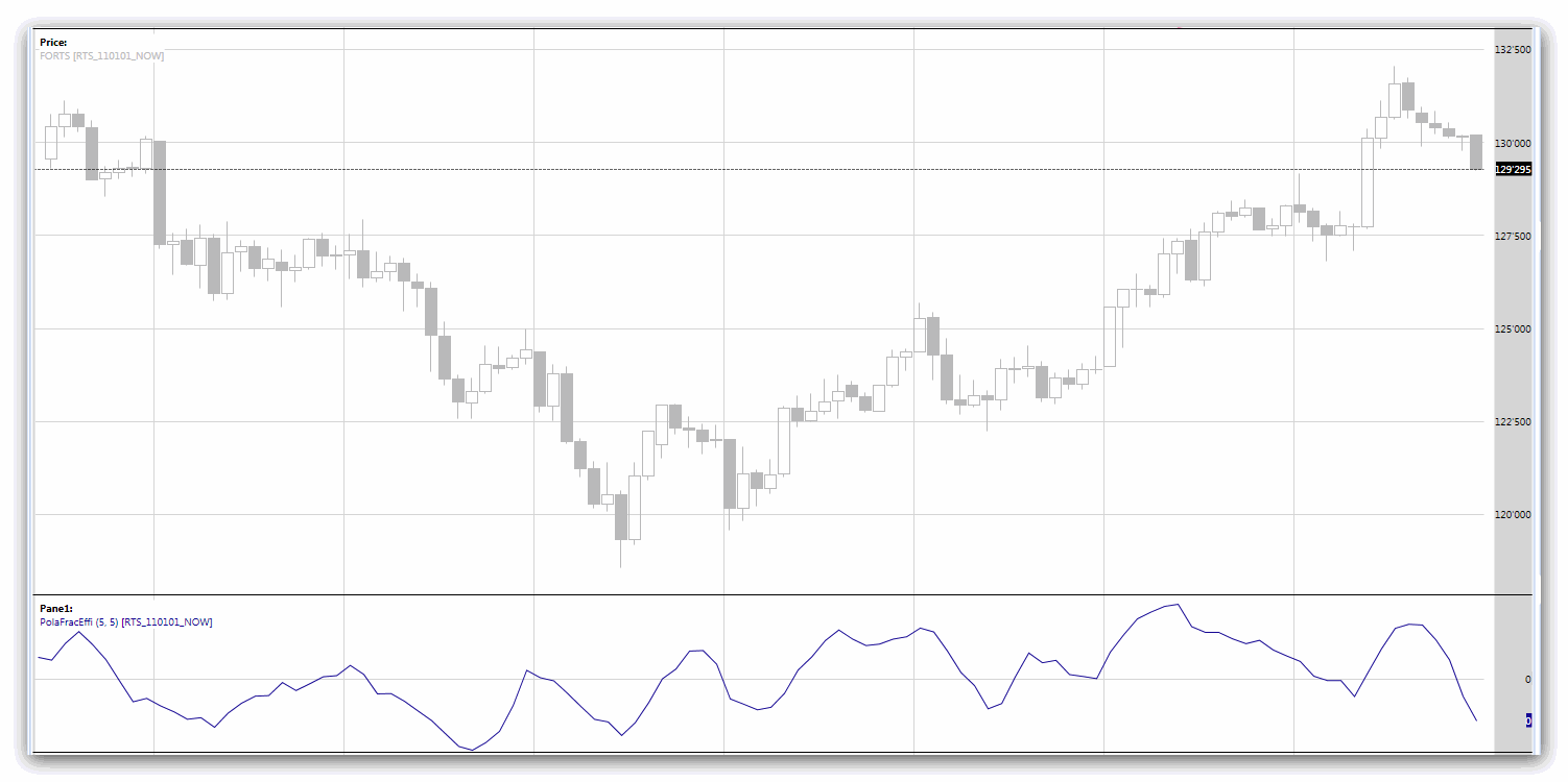 "Polarized Fractal Efficiency - технический индикатор, который показывает эффективность рыночных цен в текущий момент. Значения индикатора колеблются в промежутке от -1 до +1, центральная линия проходит на уровне 0. Считается, что если значение индикатора больше нуля, то для данного актива характерен нисходящий тренд. Если же значение индикатора меньше нуля, то для актива характерен восходящий тренд.