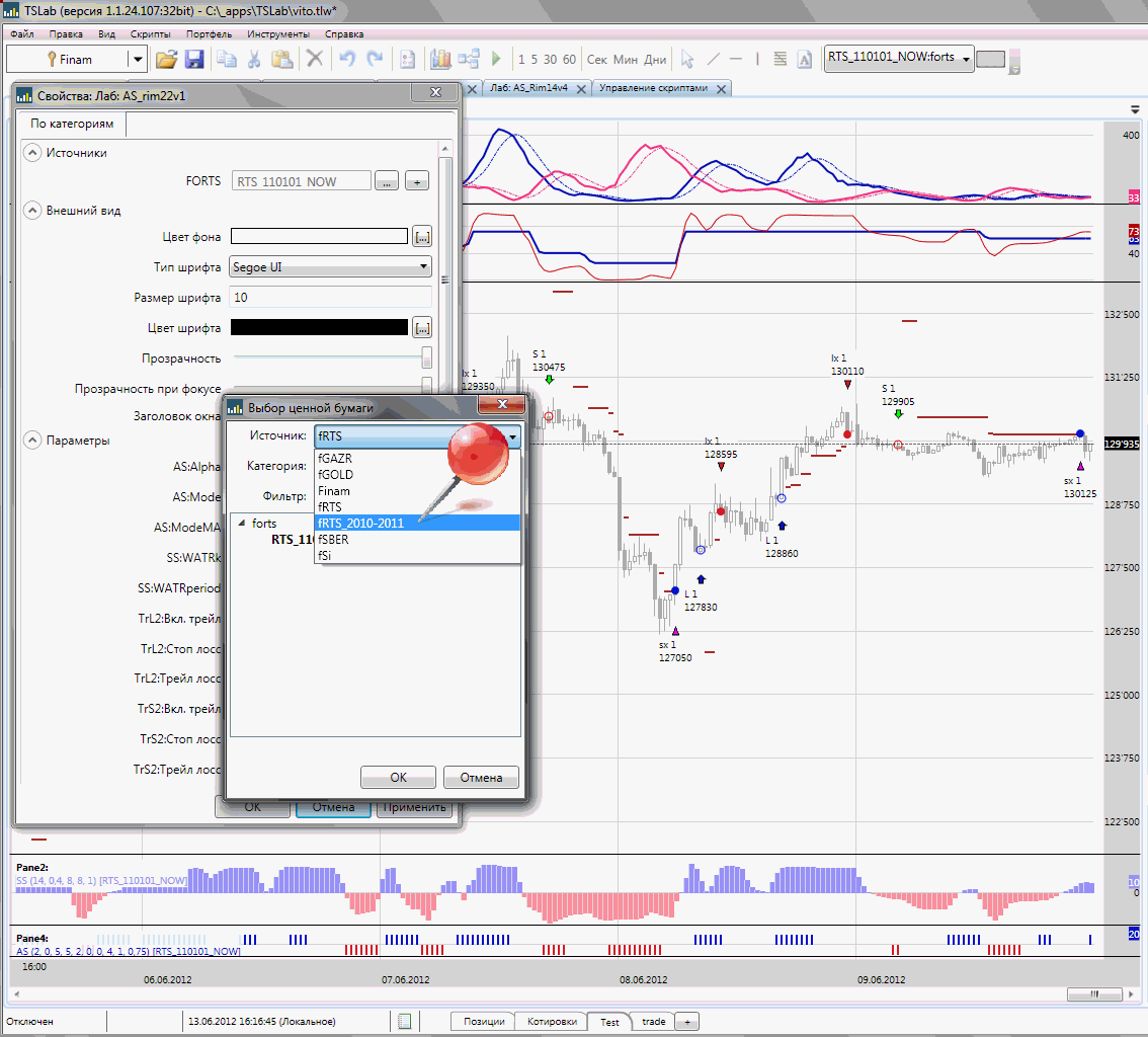 А в текущий момент у меня, например, есть текстовый источник fRTS (на скрине), который регулярно и быстро обновляю, а есть, для тестов, текстовый источник fRTS_2010-2011, на котором смотрю, как ведёт себя стратегия. Финам такую глубину данных не поддерживает (больше 2-х лет в минутках). И приходится переключаться между этими источниками.