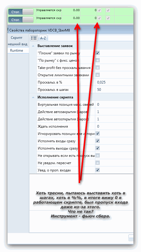 загрузил ещё один скрипт на Ri - и тоже вместо выставленного проскальзывания вижу 0 в общем ошибка объективно такая - в скрипте указывается проскальзывание (хоть в шагах, хоть в %%) и значение там и стоит, а при запуске в работу - боевой скрипт показывает проскальзывание 0. Причём первые 2 запущенных скрипта (RIU) показали проскальзывание нормально и нормально работают, а следующие - никак. разработчики! сижу жду помощи