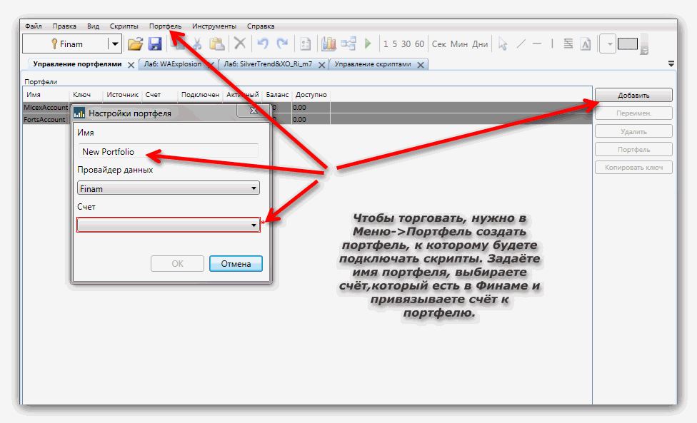 Файл New_script.avi. Там приведен пример, в котором в управлении портфелем с права есть пять кнопок, одна из которых "править". И вот после её нажатия и делается настройка "управление портфелем" - "выбор инструмента" - "настройки скрипта". А у меня в версии 1.1.25.0 нету "править"...