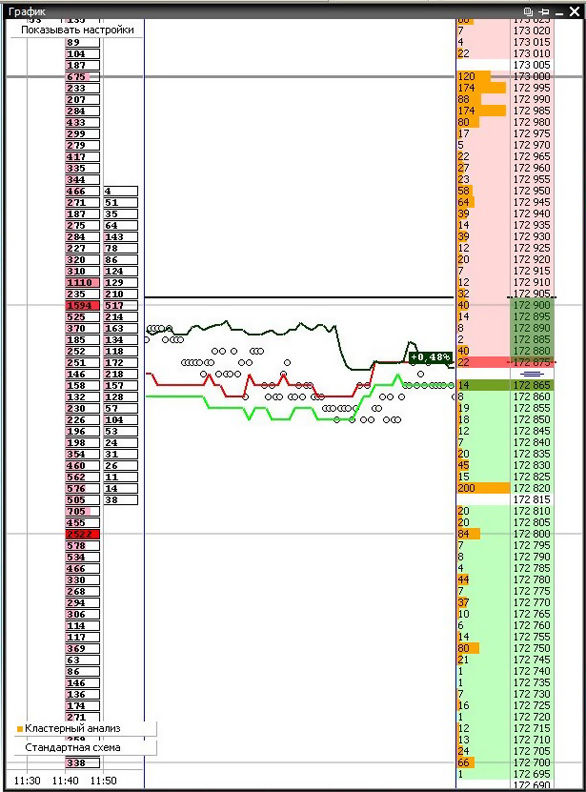 суть как я понял берём промежуток времени, например день, и слева по вертикали будет накапливаться объём по сделке в аск или бид на уровне той цены где прошла сделка, например по цене 132000 за день прошло 5000 сделок в бид и 4000 сделок в аск, эта инфа отображается на против цены 132000 и т.д. на всех ценах в итоге можно будет видеть на какой цене развернулась битва (наибольший объём в аск или бид) и кто победил, и на этой инфе уже строить алгоритм