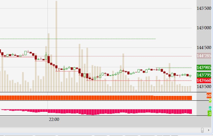 В главном окне: на правую шкалу источник (на рост т.зеленый, на падение (Альт. цвет) - т.красный) + уровни из формул, на левую объем, с настройками прозрачности "180". В нижних панелях - данные из формул в виде нескольких широких гистограмм, но выводится только отличное от нуля, остальные принимают значение "0". На самой нижней панели последнее значение красного цвета "-0.97", оно же на шкале отображается зеленым цветом, но с округлением: "-1". Кстати, об этом уже писал с год, наверное, назад, очень неудобно, когда такое округление. Если значение находится в интервале от 0 до 1, на шкале всегда отображается либо 0 либо 1. Просьба обратить и на это внимание. В 1.1.27.36 все графики с различным выводом на них индикаторов принимают вид как на скрине, т.е. отличное от 1.1.27.15.