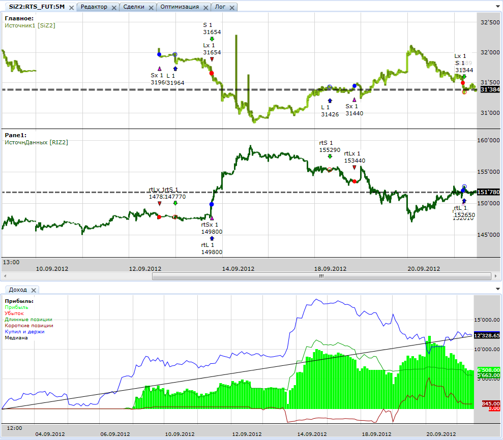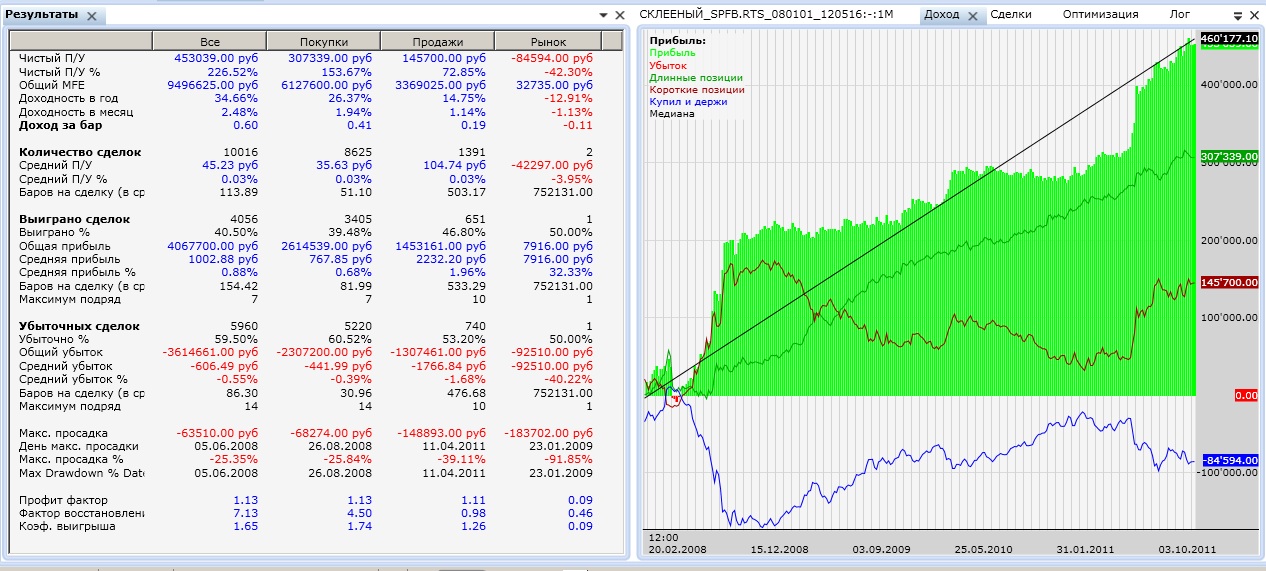 и позиции у вас открываются в одну сторону? тогда да. арбитражем будет открытие в разные стороны при несколько измненных условиях. если я не ошибаюсь. но мой пример(псевдоарбитраж) призван оправергнуть ваше утверждение что Ri ни кому ни чего не должен одним простым способом - вход выбирается на основе Si Тот вариант что вы показали имеет среднюю прибыльную сделку в 1000п то есть по сути он заработал 200т в 2008 году, 100т в августе 11-го, а остальное время зарабатывал не особо. то есть сделки большие и продолжительные. продолжительность в сделке 150 баров (незнаю какой таймфрейм и есть ли переносы) то есть целесообразность сделки риск/доход В моем случае 250п средняя прибыльная сделка и продолжительность в сделке средняя 22 бара и только внутри дня) то есть необходимо учитывать это. но главно что позиции рыночно нейтральны, а в вашем случае?