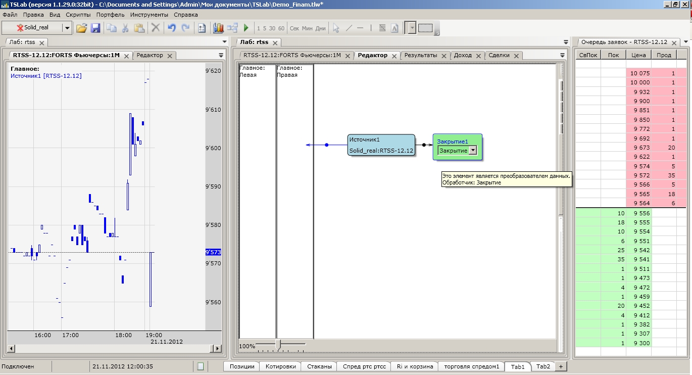 на прикрепленной картинке график фьюча на ртс стандарт, "скрипт", который генерирует этот график и стакан, счет реальный, стакан постоянно обновляется, всё вроде нормально, но никак не могу понять, почему график показывает одно число...а в стакане другое, настройки скрипта: интервал 1 минута, интервал пересчета - сделка, пересчет по каждому и обновлять в реальном времени включено...сейчас, когда пишу - в стакане 9567/9564, на графике 9573 и стоит на месте????