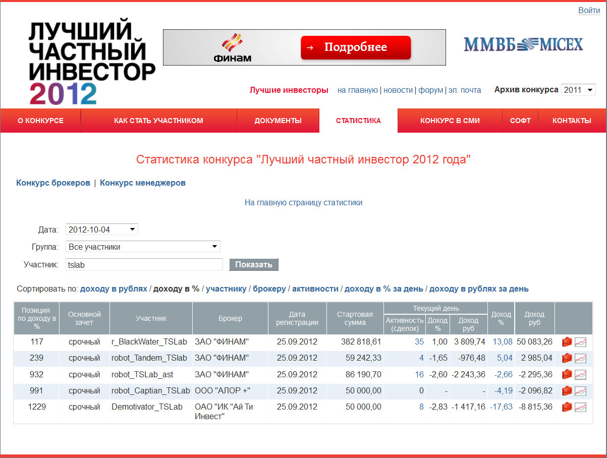 вот тут забавная статистика по итогам лчи 2011 http://www.2stocks.ru/main/stocktrading/497/bpiars221211?year=2012Официальная статистика ЛЧИ-2011, как и прежде, поражает воображение: 1-е место по доходности 11 402%, 2-е место — 7 832%, 3-е — 6 320%. В этом году общий результат участников ЛЧИ за два с половиной месяца превзошел индекс ММВБ (+1,98%) и составил +5,07% (+41,5 млн руб. при стартовой сумме 818,8 млн руб.). Из 1 464 участников «в плюсе» оказались 602 (41%).Интересно, а в целом по рынку какой процент участников оказывается в плюсе?