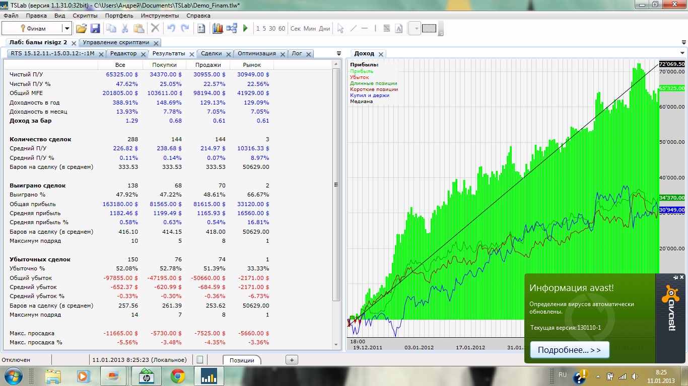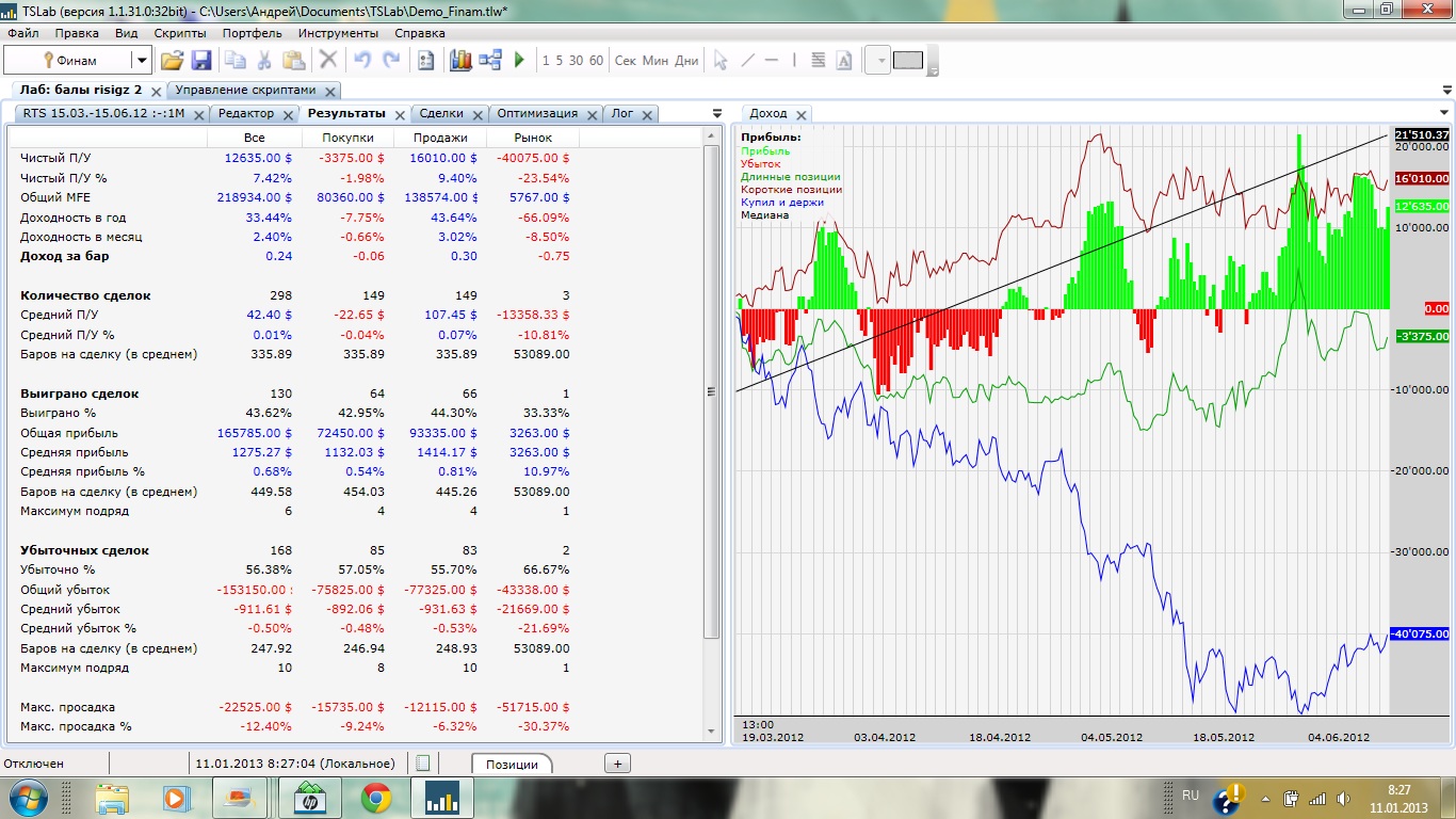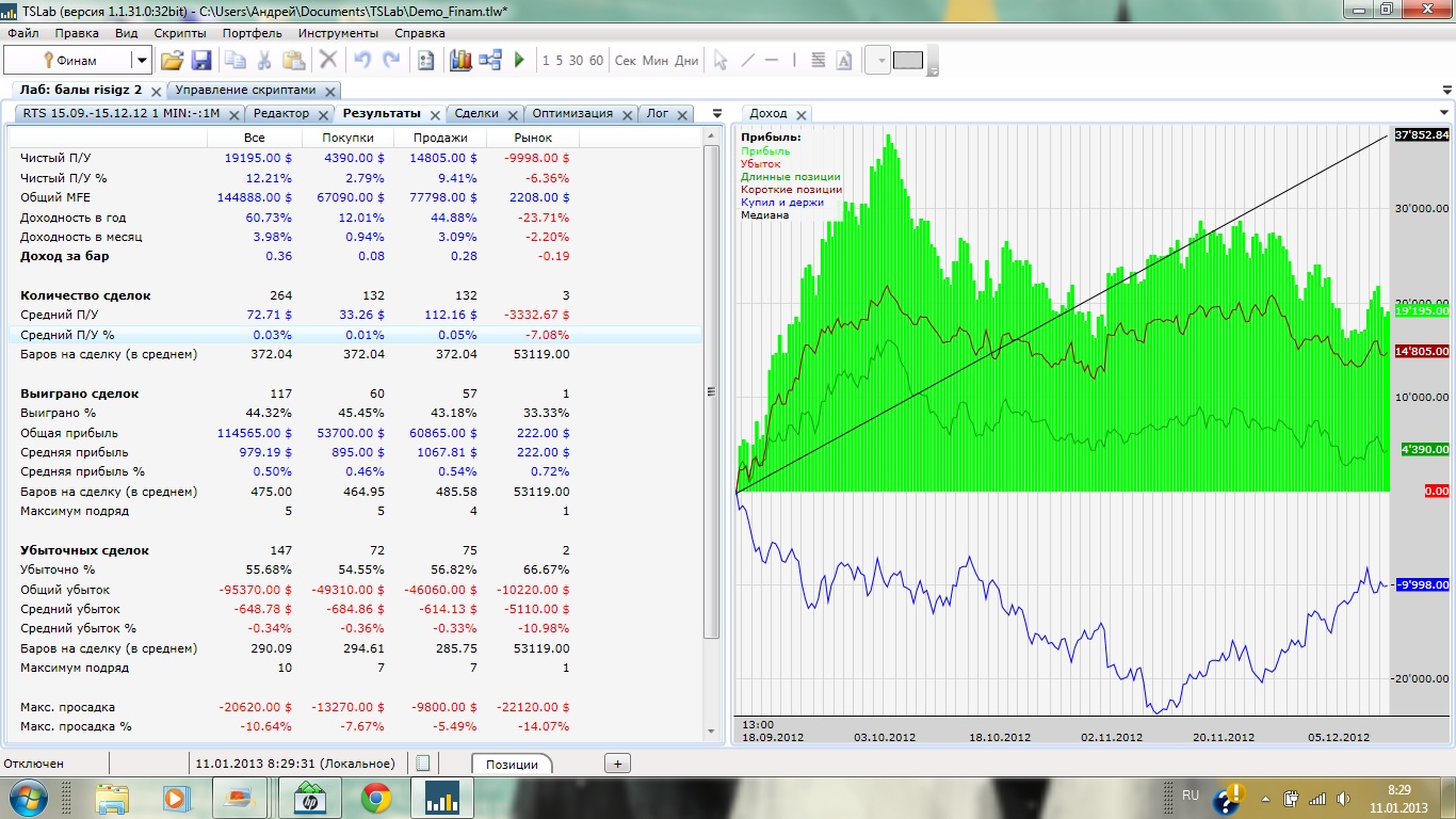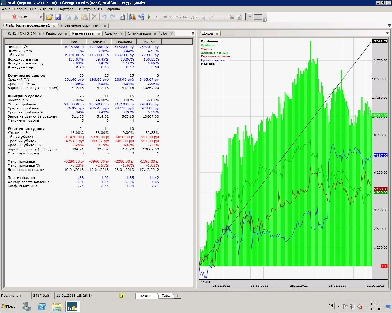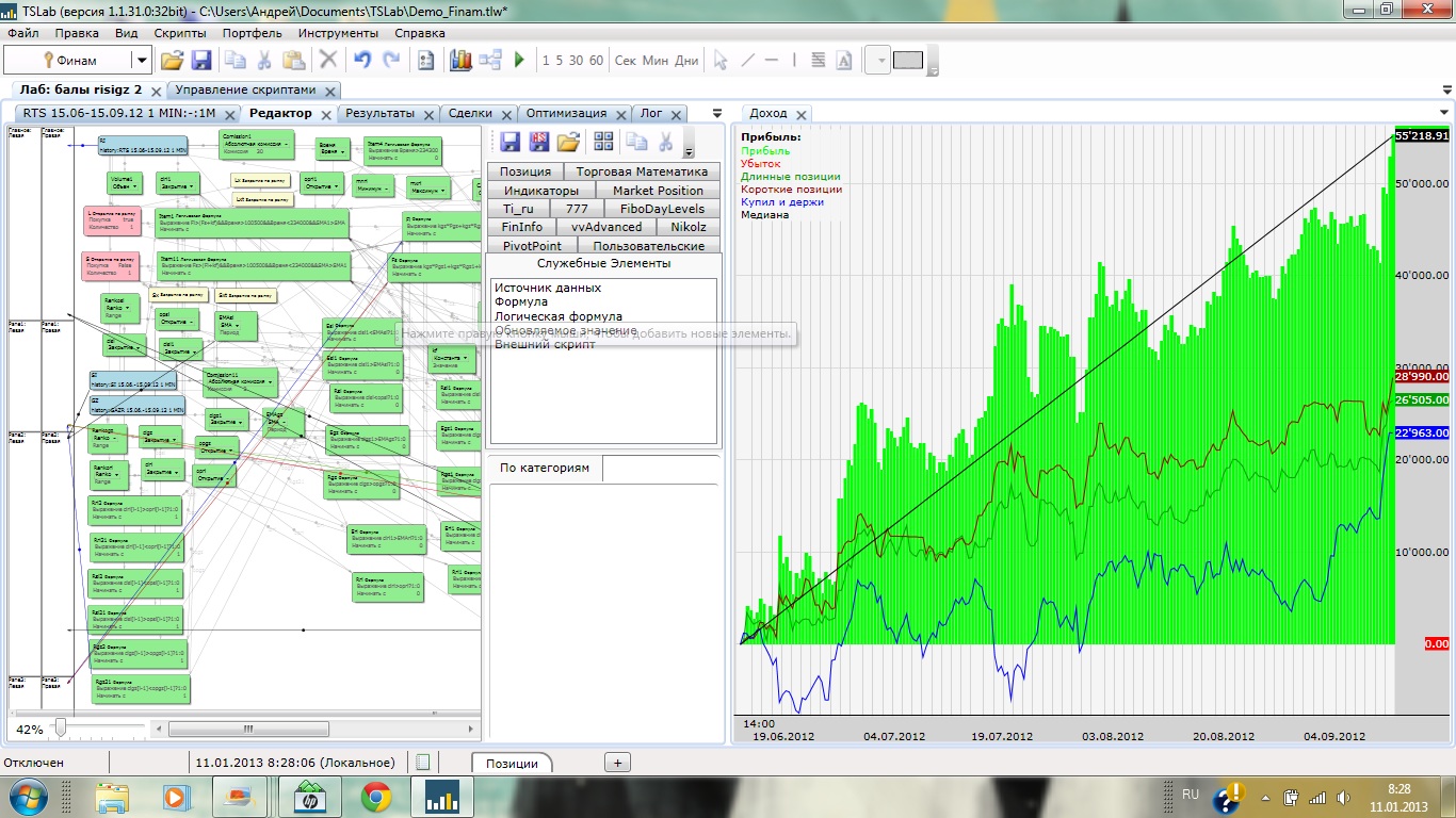 Основа скрипта формула вида: к*х+к1*х1+к2*х2..., где к-коэффициент, х-событие влияющее на движение цены(значение х - 1 или 0), то есть если событие состоялось, оно идет в зачет. В качестве событий взял движение шага ренко, нахождение цены выше/ниже скольз. средней, нахождение цены выше/ниже Parabolika, всплеск объема, все события по трем фьючам, RI,SI,GZ. скрипт переворотный (интрадей) с ограничением по времени, торгует одновременно RI и SI(10 лотов), в разных направлениях. Вход/выход в соответствии с движением скольз средней по 2м основным формулам.