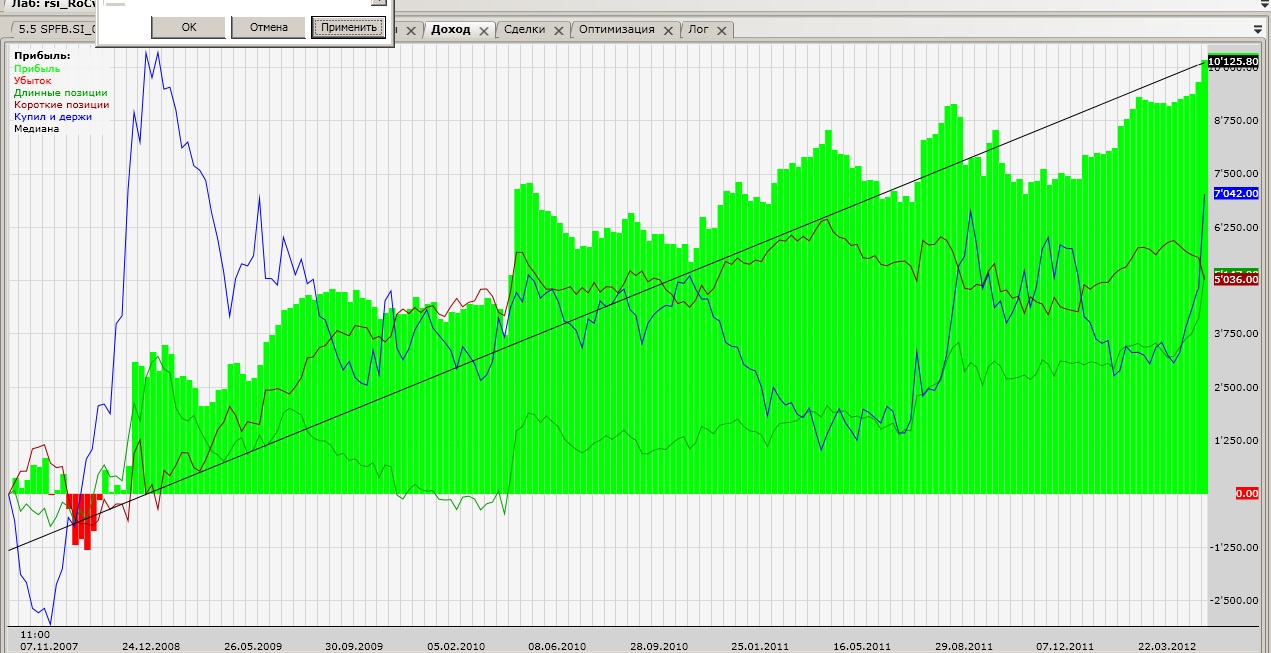 Всех приветствую, выкладываю скрипт и результаты по последний четырем фьючам, дальше не тестил. Параметры взяты при оптимизации декабрьского фьюча. Основа скрипта формула вида: к*х+к1*х1+к2*х2..., где к-коэффициент, х-событие влияющее на движение цены(значение х - 1 или 0), то есть если событие состоялось, оно идет в зачет. В качестве событий взял движение шага ренко, нахождение цены выше/ниже скольз. средней, нахождение цены выше/ниже Parabolika, всплеск объема, все события по трем фьючам, RI,SI,GZ. скрипт переворотный (интрадей) с ограничением по времени, торгует одновременно RI и SI(10 лотов), в разных направлениях. Вход/выход в соответствии с движением скольз средней по 2м основным формулам. Прошу помочь прикрутить фильтры для уменьшения количества убыточных сделок. Или просто поделиться идеями фильтров, тайминг, EMA и пр. Так же может кто что посоветует, какие события (индикаторы) можно взять для основной формулы.