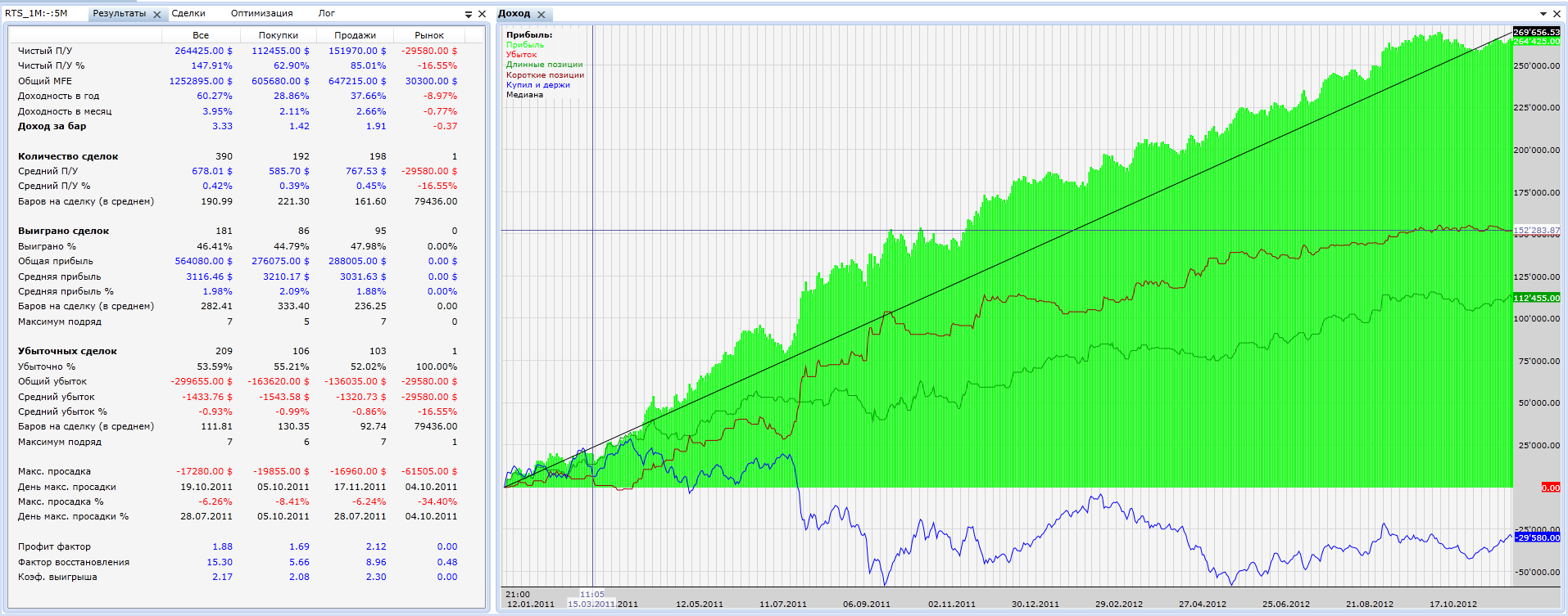 Уже 18 лет торгую только"голубыми фишками", только на российском рынке. За.....ся. Решил автоматизировать процесс торговли и заложить алгоритм принятия решения в программу, пусть работает.Вот что из этого вышло. Покажу на примере сбербанка за последнии 3и года, средний вариант. 10год от лонга + 35.77%, от шорта +8.9%, 11год лонг +17.43%, шорт + 37.13%, 12год лонг -4.34%, шорт -23.17%. За все три года (в новый год входили с позой) лонг +58.03%, шорт +34.17%. Результаты без плеча, без реинвестирования и что важно БЕЗ ОПТИМИЗАЦИИ.В открытие позы можно фигануть 50-100 мл.руб.,сейчас рынок пока еще позволяет. Личный, тороговый счет от убытков в 12 году спасло то что входил в позу по системе, а выходил по наличию прибыли даже в 0.5%. Торгую без стопов(со стопами только трусы), если бы закрывал позу в 12г по системе, то возможны убытки в пределах 0-2%. По данной системе можно торговать неликвиды, вход по системе выход по наличию прибыли либо система закроет вас с убытком 0-2%. Сейчас пытаюсь применить данную методику, отрабатываю (вход система, выход наличее прибыли) на фьючах РТС. Результат за декабрь +6,22%, январь +6.66%. Готов показать любые графики, таблицы и т.д. Что продаю? Продаю скрипты на фишки. Скрипт от лонга на одну бумагу 100т.р. в год, скрипт от шорта на одну бумагу 100т.р. в год. Возможны варианты, готов к обсуждению.Демо вариант на 1-2 недели бесплатно.