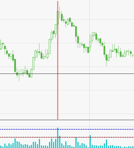 Сигнал на вход: большая свеча с длинной тенью по ходу движения + обьём на этой свечке в несколько раз больший, чем на предыдущей (минимум раза в 2). Фильтром может служить то, что до этой свечи был хороший тренд и цена двигалась практически без откатов, соответсвенно входим против этого тренда, ожидая, что произойдет разворот. Слишком абстрактно. определяя тренд я лучше в него войду)) объем фиксированный но отфильтрованный! Тренд уже видно постфактум, его нужно только константировать, обьём у меня получился больше 7000, на примере синий пунктир.