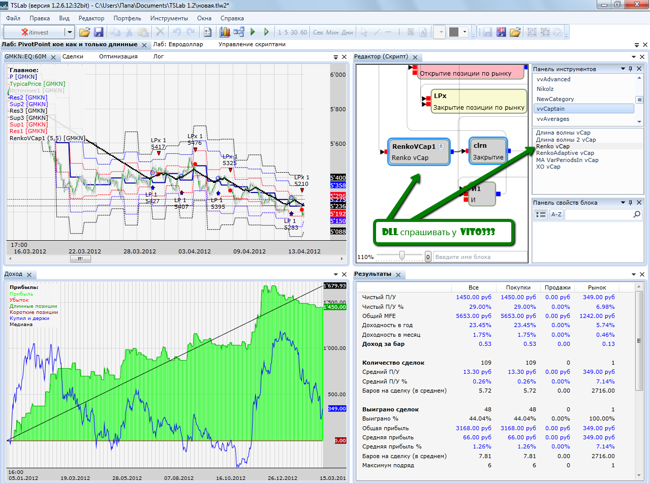 Красота!!! Эксперимента ради изменил Ваш скрипт. Выкладываю. Но фильтр по тренду сделан на специфической DLL-ке (всего лишь ренко) и спрашивать её надо у Vito333, это его разработка и он ей распоряжается. Может ещё кто то чего то добавит или изменит и мы всем ТСЛабом станем богачами