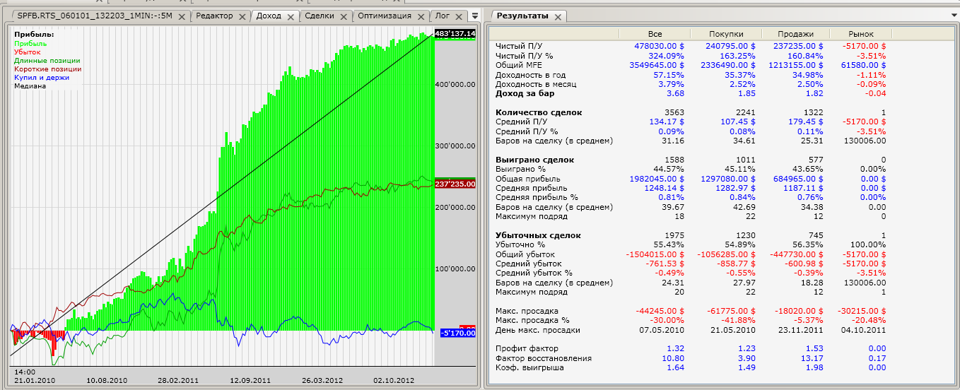 Итак, система тестировалась на интервале 06.12-11.01.12. Учитывает фазы рынка как направленного движения так и низкоамплитудного боковика. Чистая рыночная торговля (без изменения параметров) – 01.2010 и 11.01.2013. Т.е полученные стабильные результаты в период 06.12-11.01.12 я накладываю на 01.2010 и 11.01.2013. И отслеживаю насколько они стабильны и соответствуют заявленным критериям качества.