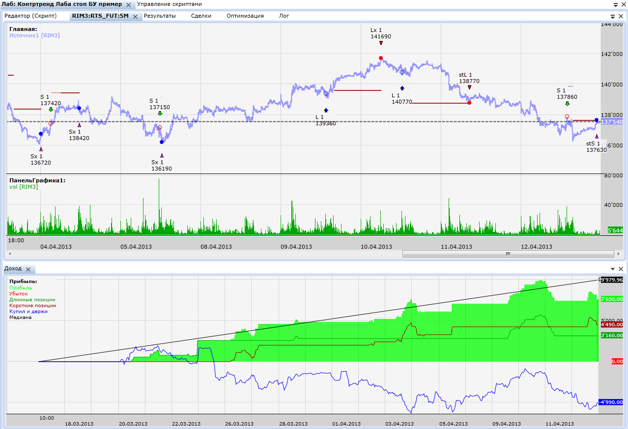 Что еще требуется от меня, если без динамики? Скажите и я уточню чего мне хотелось бы. В догонку темы ложного пробоя. Сделал для себя скрипт, когда на больших (пиковых) объёмах котировки гонят в противоположную сторону от текущего направления (ловля "кукла"). В этом случае заходим против "кукла". Но и здесь масса сложностей. Например, пик объёма всегда разный и мерить его простой константой не всегда правильно. Во-вторых ложный пробой может оказаться не таким и ложным, а истинным  Я конечно проверяю идею на счету, но не уверен в её жизнеспособности. Реализацию тоже рассказывать не буду (идею не скрываю, рассказал всё как есть) потому как это и есть авторское know how.