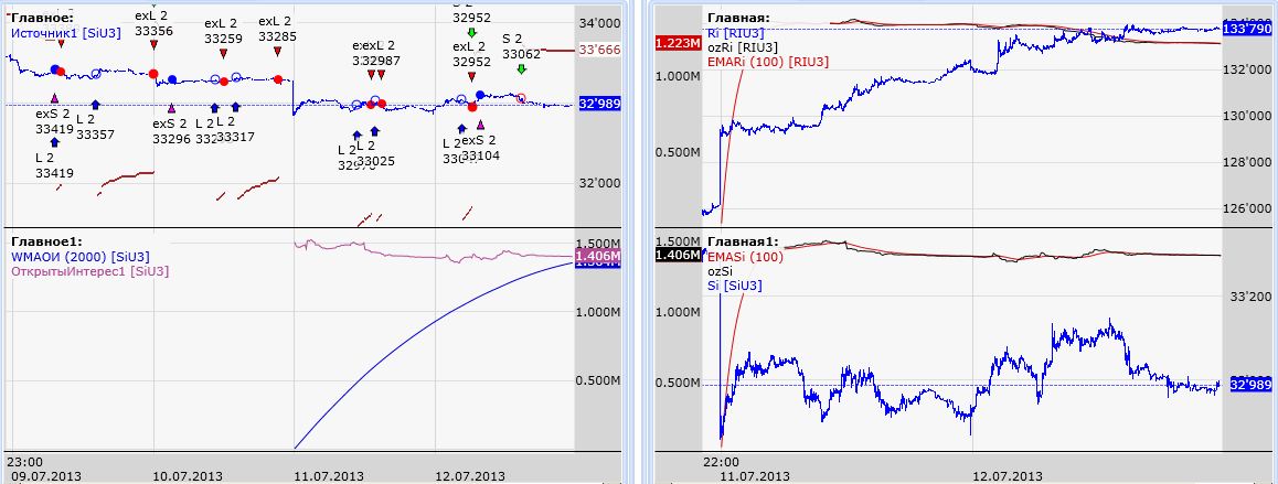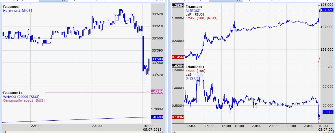 опираясь на 2 тезиса 1 -в версии 1.2 у ОЗ появилась история, 2- ОИ не хранится и сбрасывается в 10-00, пробуем прикрутить к ОИ МАшку для сглаживания . и тут начинаются не понятки : на Снимок1 видно что вечером есть ОИ и от него есть EMA которая берет данные через обновляемое значение, все логично. но наступает 10-00 (Снимок2), ои обнуляется и ема ведет себя так как будто ОЗ не имеет истории и отдает ее "разгонные" данные.