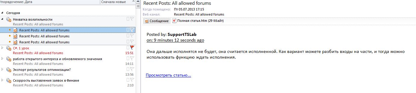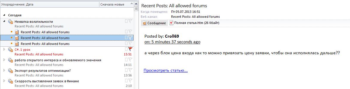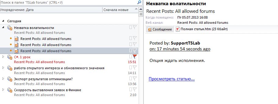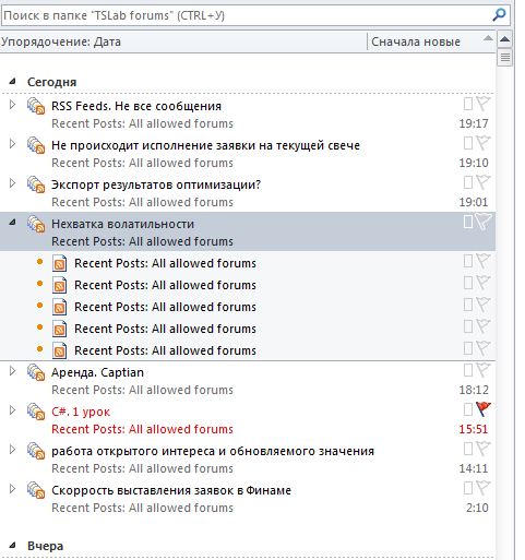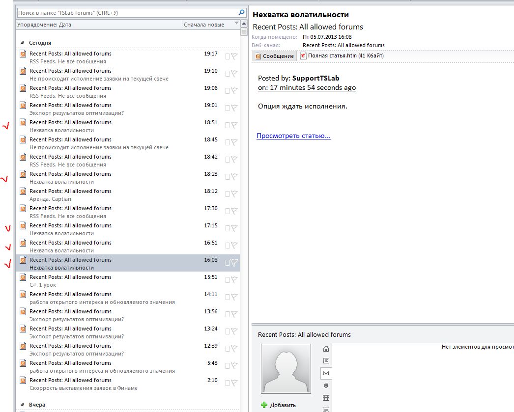 Добрый день! В Rss "Recent Topics: All allowed forums" и "Recent Posts: All allowed forums" попадают не все сообщения с форума. Особенно часто нет сообщений от модераторов/команды ТсЛаб . Просьба проверить. Возможно, проблемы на моей стороне. Rss подключены к Microsoft Outlook 2010.