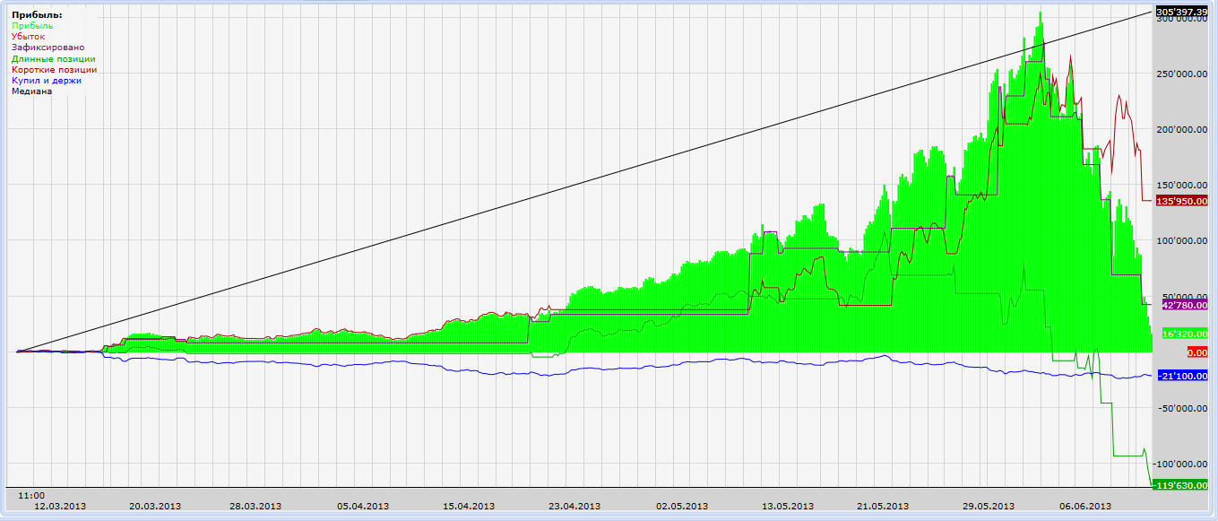 Суть алгоритма — торговля на пробой уровня с «постоянным» присутствием в рынке ( то есть сделки реверсные). При накоплении профита, позволяющего совершить сделку на +Хлотов, то сразу бросается Х количество лотов, на которое хватает денег в портфеле, то есть идет полная загрузка.