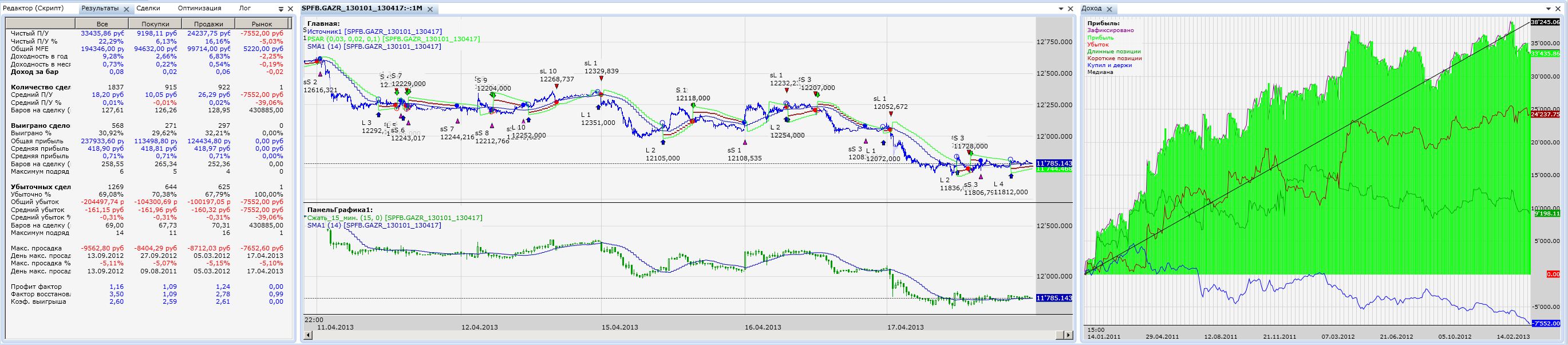 Появилась идея сделать вход на параболике более быстрым, т.е. вход не на открытие следующей свечи, а раньше (вход внутри бара). Для этого взял меньший тайм фрейм 1M сжал до 15M. На 15 минутах построил скользящую для фильтра и сам параболик. Вход на пересечении цены на 1M и параболика на 15M получается, но начинаются ложные заходы т.к. параболик "перевернеться" только на следующей свече M15. Скрипт в приложении. Буду рад услышать Ваши соображения по поводу ложных входов.
