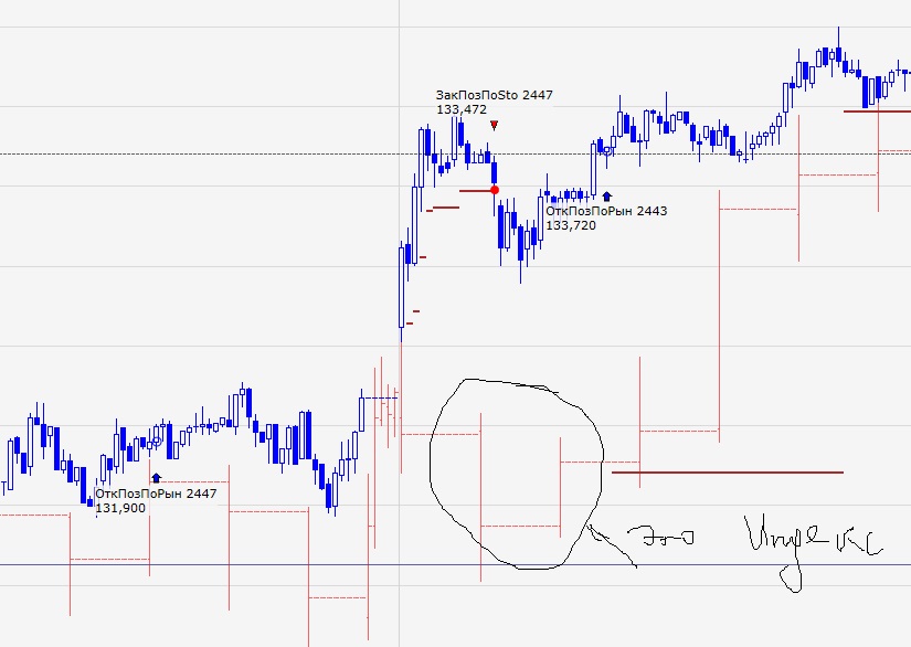 Добрый день! При создании одного из алгоритмов с использованием 2-ух источников данных случайно закачал не те исторические данные. А именно у бумаги и индекса были разные ТАЙМ-ФРЕЙМЫ. У бумаги 5мин, а у индекса 60 мин... Работаю на 5и минутках. Получилась картинка как в примере (рис. 1)
