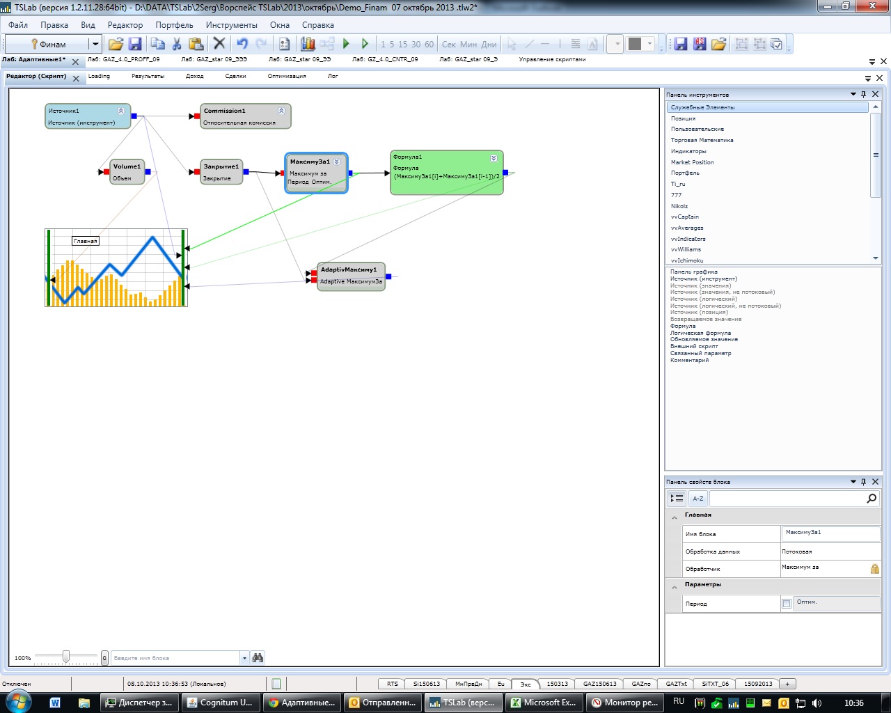 Здоровское решение,только вот нормально загрузить не получается.. версия 1 2 28 Core 3 2.6 Гц AMD 8 Гб 64 бит..... с один адаптивным МинЗа грузит минуть пять текущий фьюч, а всю историю так и не загрузил....лаба зависла, даже пришлось с резерва восстанавливать....конечно, rav81 предупреждал, но что бы так... Ну в описании все четко описано. Сколько свечек на сколько гигабайт озу. У вас ТСЛаб 64 битный запущен? Это обязательный атрибут. Иначе даже пытаться не стоит. Сожрет всю память. Тут либо нагибать процессор на сутки, либо нагибать ОЗУ. Выгоднее нагибать ОЗУ. Вот здесь вариант "Минимума за" и "Максимума за" не требовательный к памяти. Да решение я такое тоже применял. Но такое решение круто проиграет в скорости. Тем более в режиме оптимайза. Делал упор на скорость. Пришлось отдать сатане ОЗУ  ПС: может конечно можно чтото придумать не нагибающее и проц и озу, но не придумалось. Я 3 варианта адаптивных индюков пробовал. То что выложил, самый скоростной. В разы быстрее других решений.