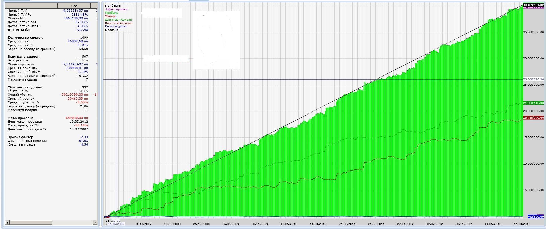 Вопрос разработчикам стратегий! Удалось ли написать стратегию которая удовлетворяет следующим требованиям: 1. стабильный восходящий доход близкий к медиане в среднем более 20% годовых на истории с 2009 года. 2. стратегия работает при одних и тех же настройках (переменных) на 2-х и более инструментах. 1. нет 2. да 1. Первое условие мне представляется не реализуемым. Т.е. подогнать на истории можно любой алгоритм, а вот что бы так же торговал..... рынок всё время разный. Так что считаю целью абсолютный доход, а не распределение прибыли во времени, близкое к ровной прямой. Заработать можно ровно столько, сколько "позволит" рынок и тогда, когда рыночная ситуация благоприятствует заработку (ликвидность, волатильность, отсутствие форс мажора и пр.). 2. Более того, есть стратегии, которые показывают близкий результат при разных настройках. Это те, в которых управление капиталом доминирует над логикой сделок.