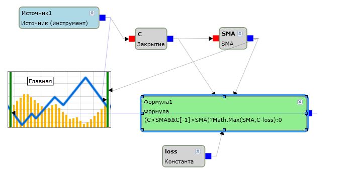 Видимо я, что неправильно объяснил. Так как нужного ответа так и не получил. Как реализовать тогда следующие условие в TSLAB. If(C>PREV AND Ref(C,-1)>PREV,Max(PREV,C-loss),0) В условиии мы ссылаемся на предыдущее значение индикатора. Самое интересное, что сам индикатор рассчитывается как раз по условию. Как быть в этом случае. То есть фактически индикатор может быть построен только при условии если мы знаем его предыдущее значение. Поясню: В выражении C>PREV мы не сравниваем значение цены закрытия с предыдущей ценой закрытия (это реализовать несложно). А мы сравниваем цену закрытия с предыдущем значением индикатора, который определяется условием If(C>PREV AND Ref(C,-1)>PREV,Max(PREV,C-loss),0) Попробуйте простыми словами объяснить что хотите получить, если конечно хотите это получить с помощью визуального редактора, а не API. И тогда кто нибудь из пользователей вам обязательно поможет. Язык метатрейдера и велслаба не всем знаком.