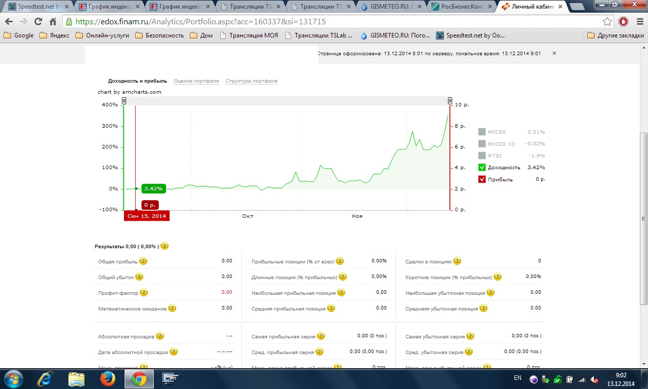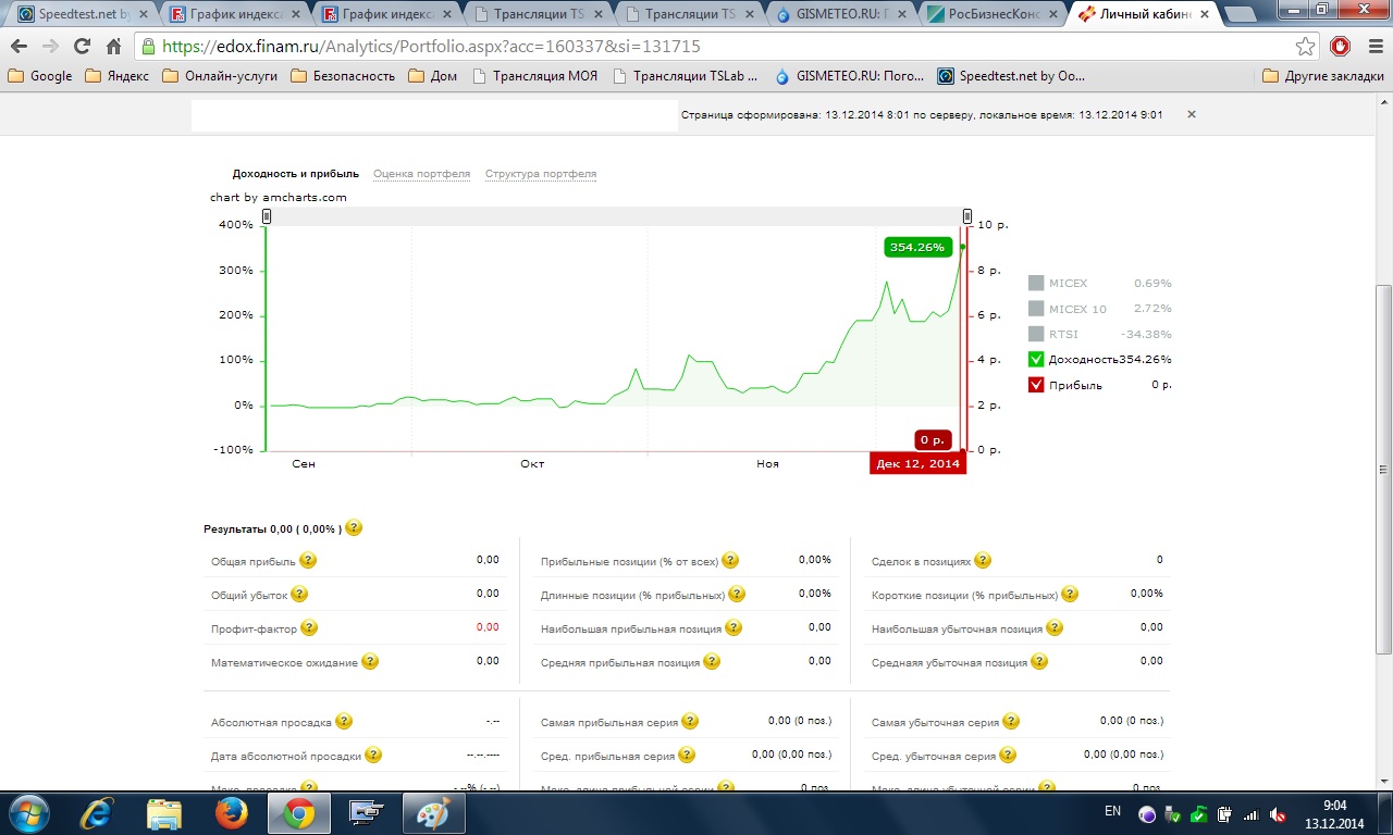 вообще, если за день более 10-15% на фьючах или акциях,а не на опционах, то с рисками что-то не так счёт не доживёт до светлого будущего +++ итоги по счету с 15/09/2014 по 12/12/2014....  ВСЕЙ команде TSLab...Ура ! Ура! УРА!!!!!!.....ну и мне ...тоже..) Для полноты картины произведем расчет для приведения к годовым доходностям : 354%/90 дней*365дня = 1 435 %% годовых по портфелю...) ТОЛЬКО с помощью TSlab можно и НУЖНО торговать )) Всем удачи и профитных трейдов ! ЗЫ а как гражданину - досадно