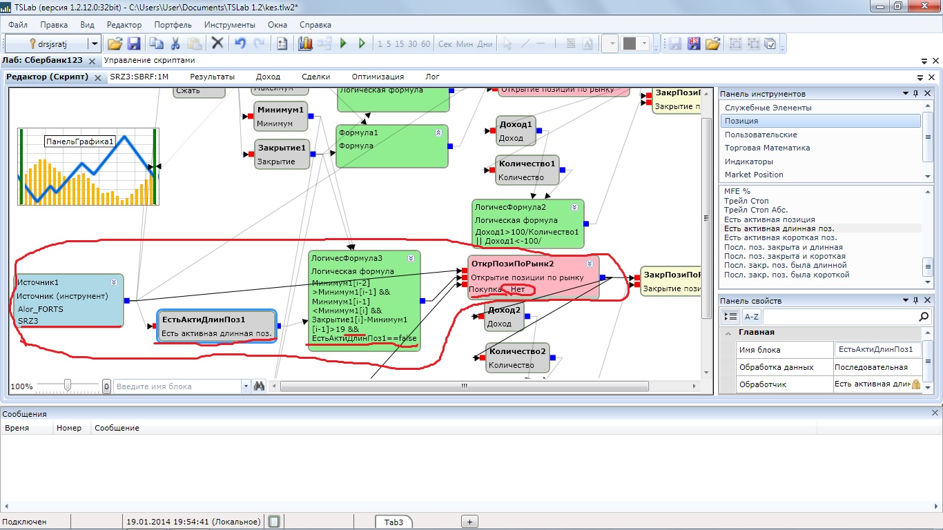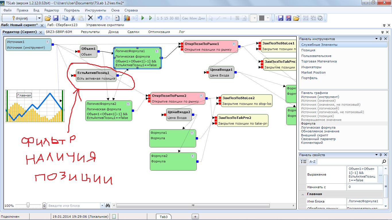 Пишу простенького робота чтобы потом проверить его на демо. Весь вопрос в том, что робот в процессе торговли может к незакрытой длинной позиции добавить короткую. И наоборот. Мне этого не нужно. Пытался добавить фильтр через блок ЕстьАктивПозиц, но в результате робот вообще перестает открывать сделки. Причем организуя торговлю по той же самой схеме на более простом алгоритме, чисто для проверки, все получается. Робот не открывает новых сделок, пока не закроет предыдущую. В чем может быть проблема? Фильтр добавляю один и тот же. На рисунке приведен работающий вариант.