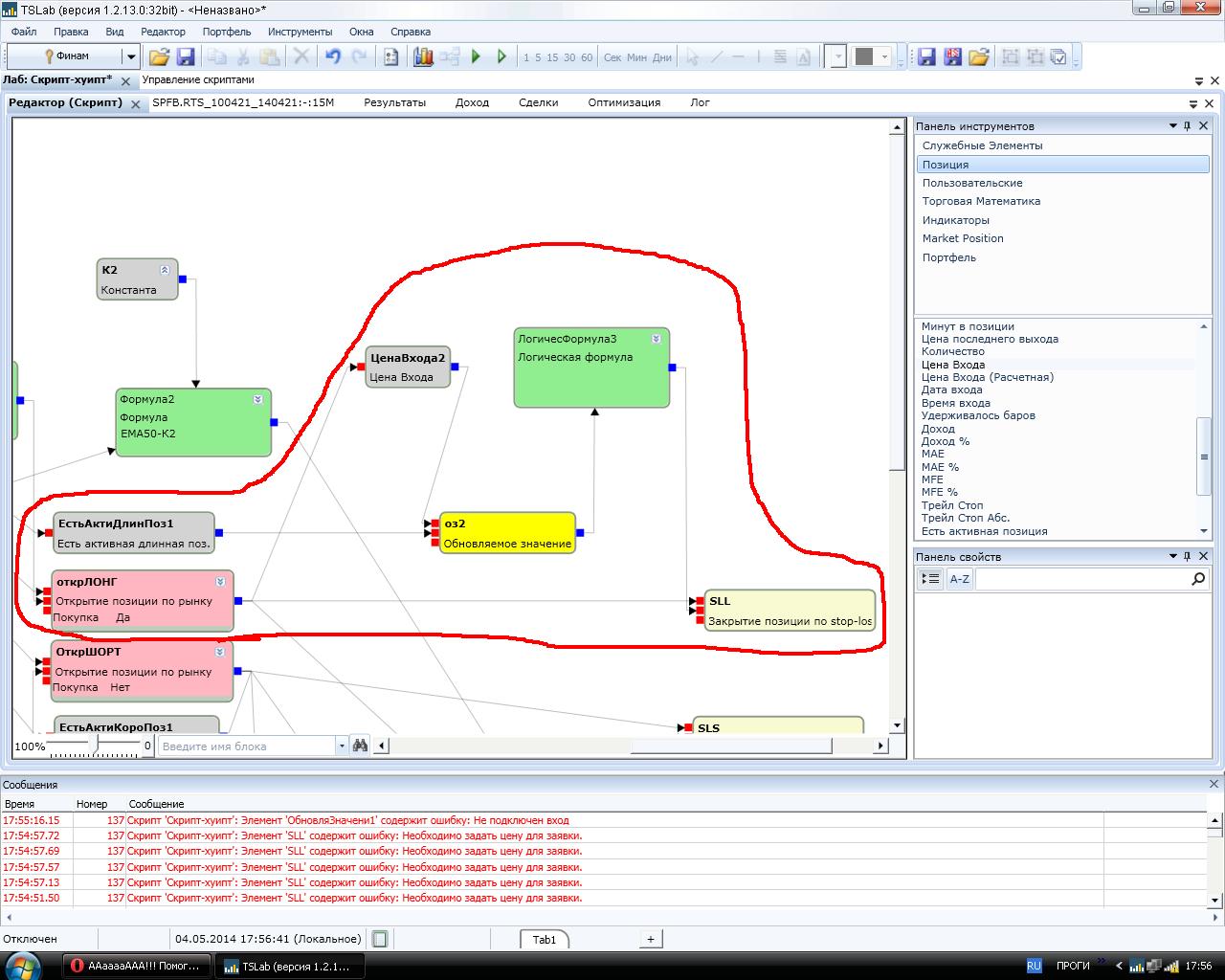 Здравствуйте. Идея: при открытии позиции после достижения ценой 500 пунктов профита перенос стопа на уровень открытия, или при достижении 500 пунктов убытка выход по стопу. Проблема: при написании условия в логической формуле, скрипт не понимает когда надо перенести стоп и херачит его прямо на уровень открытия сразу. Еще не понятна ошибка соединения блоков.