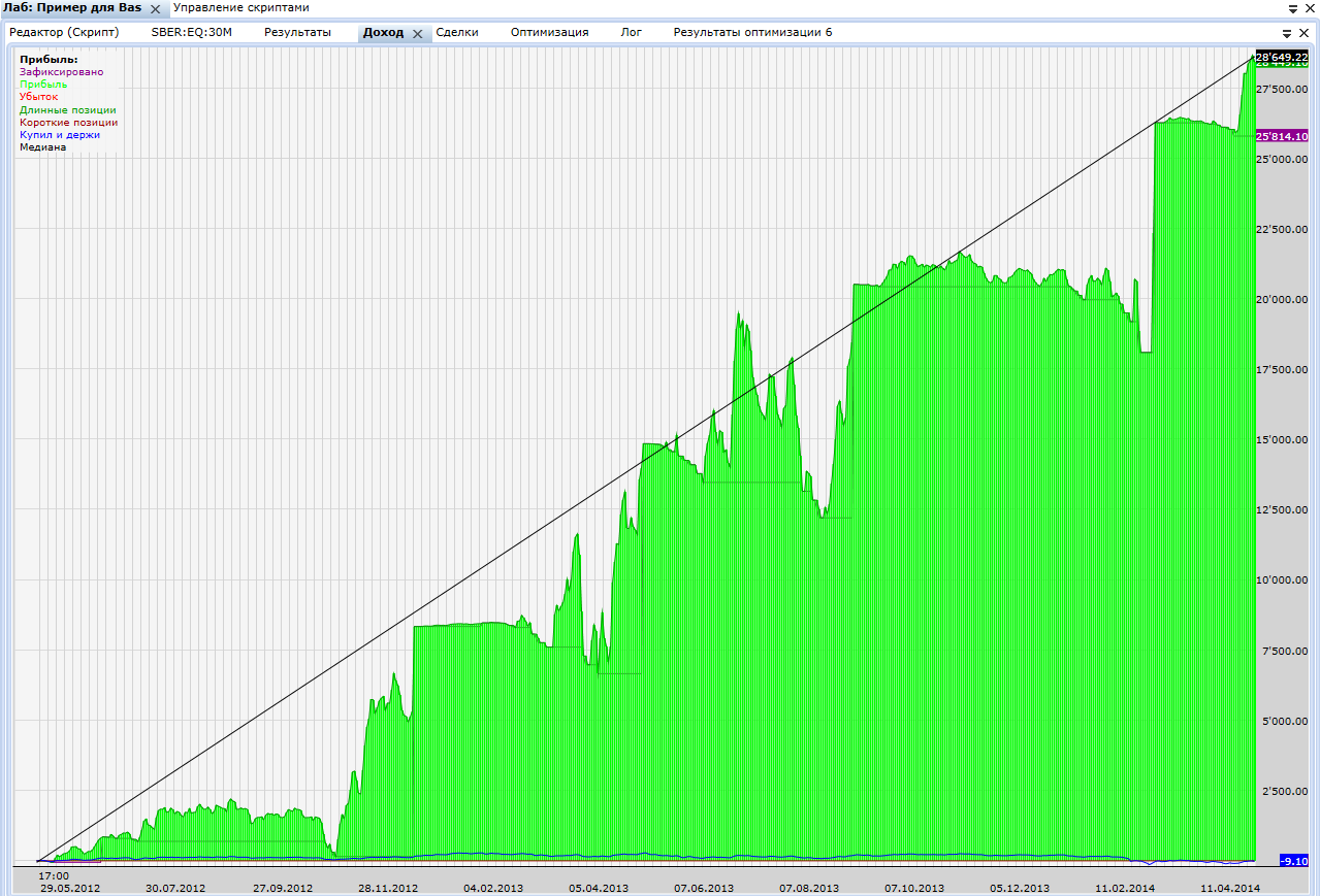 Скрины, что это работает видел))). Скрипта не вижу нигде. Сделал простенький примерчик на семь попыток входа. Сбербанк (Акции, тикер SBER) 30 мин. Надо бы не семь а штук 20, но это уже дальше сами. Заодно прикиньте сколько денег надо на мартингал  В примере максимум 63 лота сбербанка задействовано, это примерно 60 тыс. руб. Из которых большую часть времени работает только часть. Даю картинку что будет, если депозита не хватит для удвоения  Так что поаккуратнее с мартингалом. З.Ы. Если что не понятно будет, обращайтесь с этим примером к мастерам обучения. У меня педагогический дар отсутствует, увы.