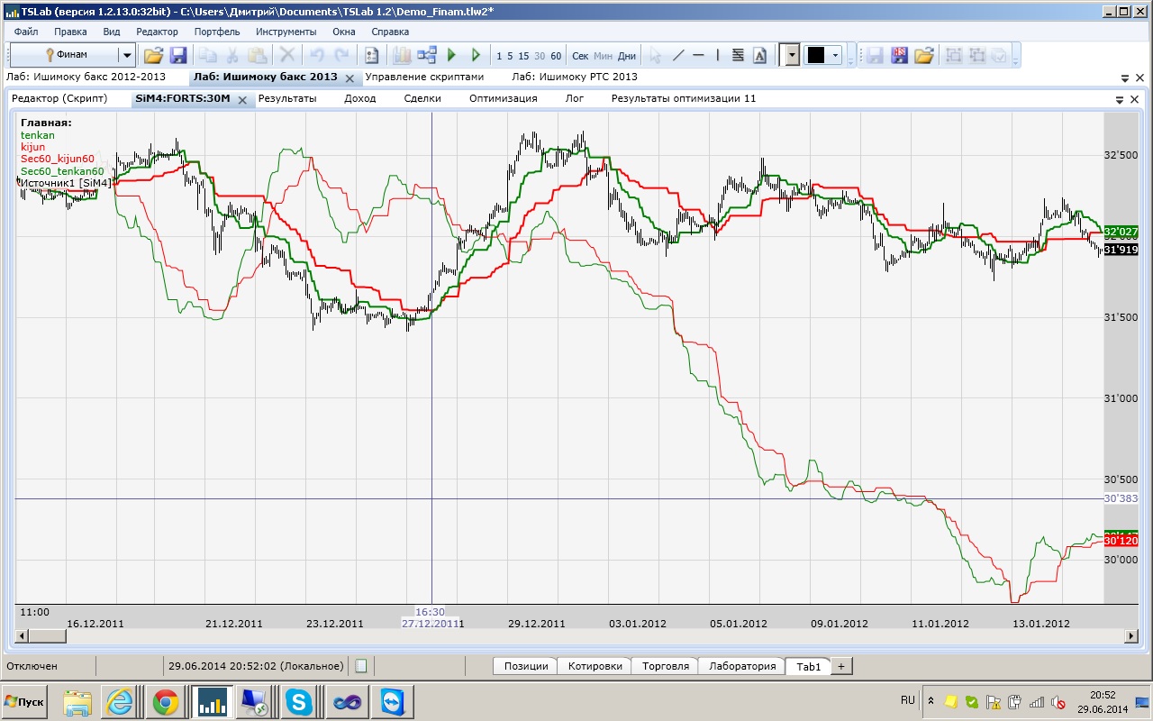 написал так var sec60 = sec.CompressTo(new Interval(60, DataIntervals.MINUTE)); var color1 = new Color(System.Drawing.Color.Black.ToArgb()); var Sec60_kijun60 = ctx.GetData("Kijun60_", new string[] { PerKijun.ToString() }, delegate { var a = new vvTSLtools.KijunSen { Period = PerKijun, Context = ctx }; return sec60.Decompress(a.Execute(sec60)); }); var kijun = ctx.GetData("Kijun", new string[] { PerKijun.ToString()+"2" },delegate { var a = new TSLab.Community.Ichimoku.KijunSen { Period = PerKijun, Context = ctx }; return a.Execute(sec); });