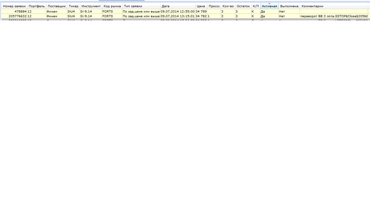 Всех приветствую. Запустил в работу скрипт. Не понятно откуда выставляются заявки (см. фото) при этом отсутствует комментарий и номер заявки существенно отличается от текущих номеров. В финаме сказали: Те, две сделки, что Вас интересуют были произведены по заявкам, выставленным с Вашего логина от TSLab, каждая из них была изначально выставлена в предыдущий торговый день перед исполнением, а потом в силу того, что срок жизни у них был задан на два дня и за первый день они не исполнились, они были перевыставлены с теми же параметрами. На вопрос, почему они не были опознаны самой программой, я ответить не смогу, поэтому вопросу Вам лучше обратиться к разработчикам программы, но в логах TSLab, как и в логах коннектора на Вашем компьютере информация должна быть точно такая же, если Вы сомневаетесь, Вы можете прислать мне Ваши логи и я Вам покажу, что данные сделки были совершены по условным заявкам, каждую из которых Вы выставили за день до исполнения. Такую же информацию я пересылаю во вложении.