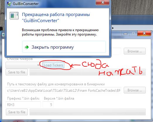 пытался использовать Вашу разработку для конвертации данных выложеных в теме по btc-e и он постоянно закрывается по ощибке при нажатии load tikers. у меня win7 x64 в чем может быть проблема?