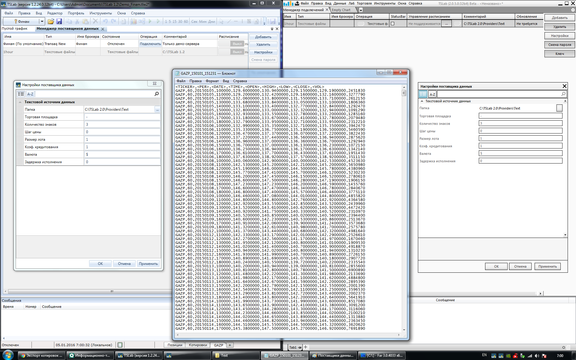 Аналогичная проблема с импортом текстовых файлов в версии 2.0 (установлен последний билд 2.0.11). Сначала думал что дело в самих данных, но снёс 2-ую версию, вернулся на 1.2 - всё работает, подгружает данные. Опять удаляю 1.2, ставлю 2-ую, подключаю ТОТ ЖЕ самый файл с данными -> не загружает историю. Месторасположение файла с историей в корне C:, папка "c:\History\". В ходе тестирования загрузки исторических данных меняется ТОЛЬКО сам tsLab, больше ничего не меняется для чистоты эксперимента. Разработчики, ау - куда копать? Та же самая проблема. Скачал 2.0, намучился. Ничего не получилось. Потом по совету знакомых поставил 1.2 — всё отлично.
