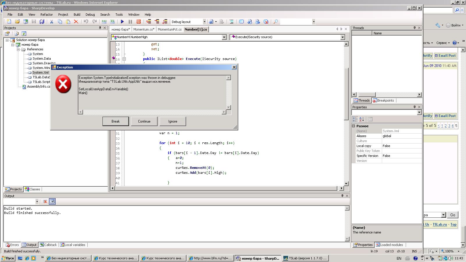 Вот из этих ссылок посмотри, я ими пользуюсь http://www.tslab.ru/ubb/ubbthreads.php?ubb=showflat&Main=156&Number=3609#Post3609классы описаны в справке по API на сайте ТСЛаба (хотя с наскока их не разобрать сразу..-))) книжки по C# можно по инету пошарить, но там такие толмуды, в основном - война и мир отдыхает-)), больше времени будет уходить на перебор того в какую книгу вникать, чем её читать... Вот от откуда ты взял: IBar2DoubleHandler ? еще вот: ты обозначил переменную var high = source.HighPrices;, но нигде не используешь, соответственно source.HighPrices это не название?(я имею ввиду где ты взял точное названия вывода данных?) - СМОТРИ в СПРАВКЕ API ТСЛаба Еще при компиляции у меня вот так, не знаешь в чем дело?