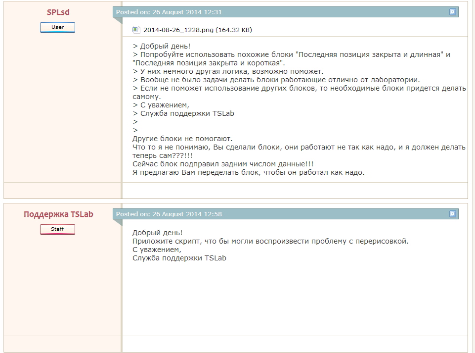 я полагаю что специалисты которые проблемы решают, непосредственно заняты решением проблем и форум не читают. Если вы хотите таки чтобы проблемы ваши решались, стоит писать по назначению. Вас уже попросили отправить данные по назначению. Вы упорствуете в своем упорстве. Это не конструктивно. Я не понимаю, я обозначил ошибку, но если они не хотят её решать только из-за того что она написана на форуме, то тогда это говорит о многом!!! Уважающие себя фирмы, если им клиенты находят ошибки, ХОТЯ БЫ говорят СПАСИБО, как минимум, или поощряют бесплатными сроками использования программы, или денежные компенсации!!! А что у нас??? Вы почитайте http://forum.tslab.ru/ubb/ubbthreads.php?ubb=postlist&Board=1&page=1 к каждом обновлении исправление ошибок и иногда какие-то примочки. Т.е. все эти ошибки находят юзеры, КОТОРЫЕ платят деньги, сталкиваются с этими ошибками, теряют СВОИ деньги на этих ошибках, пишут в саппорт, и только потом их исправляют, и всё. Ни спасибо, ни поощряют. Т.е. если смотреть правде в глаза ТСЛаб ещё очень сырой, раз выскакивает столько ошибок! А мы (юзеры) просто тестеры, которые попадают на баблы из-за этих ошибок, и если после все этого им НЕ СОЙТИ ДО НАС ЮЗЕРОВ, и не почитать форум, то тогда я не знаю, как так... Наводит на всяки нехорошие мысли, но я верю в лучшее, пока что.