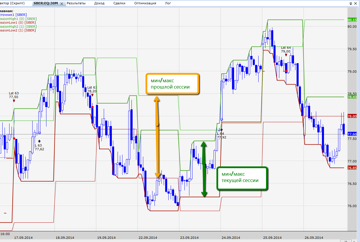 Добрый день! Подскажите пожалуйста пример как сделать среднее движение цены за день например на ртс, с закрытия прошлой сессии с 23:50 до 23:50 этого дня, то есть на сколько за данное время инструмент в среднем проходит однонаправленно. Заранее спасибо за ответ) Можно самостоятельно, с помощью Обновляемого Значения, указав время обновления ОЗ окончание сессии. Можно воспользоваться готовыми, пользовательскими индикаторами nikolz http://forum.tslab.ru/ubb/ubbthreads.php?ubb=showflat&Number=2425#Post2425