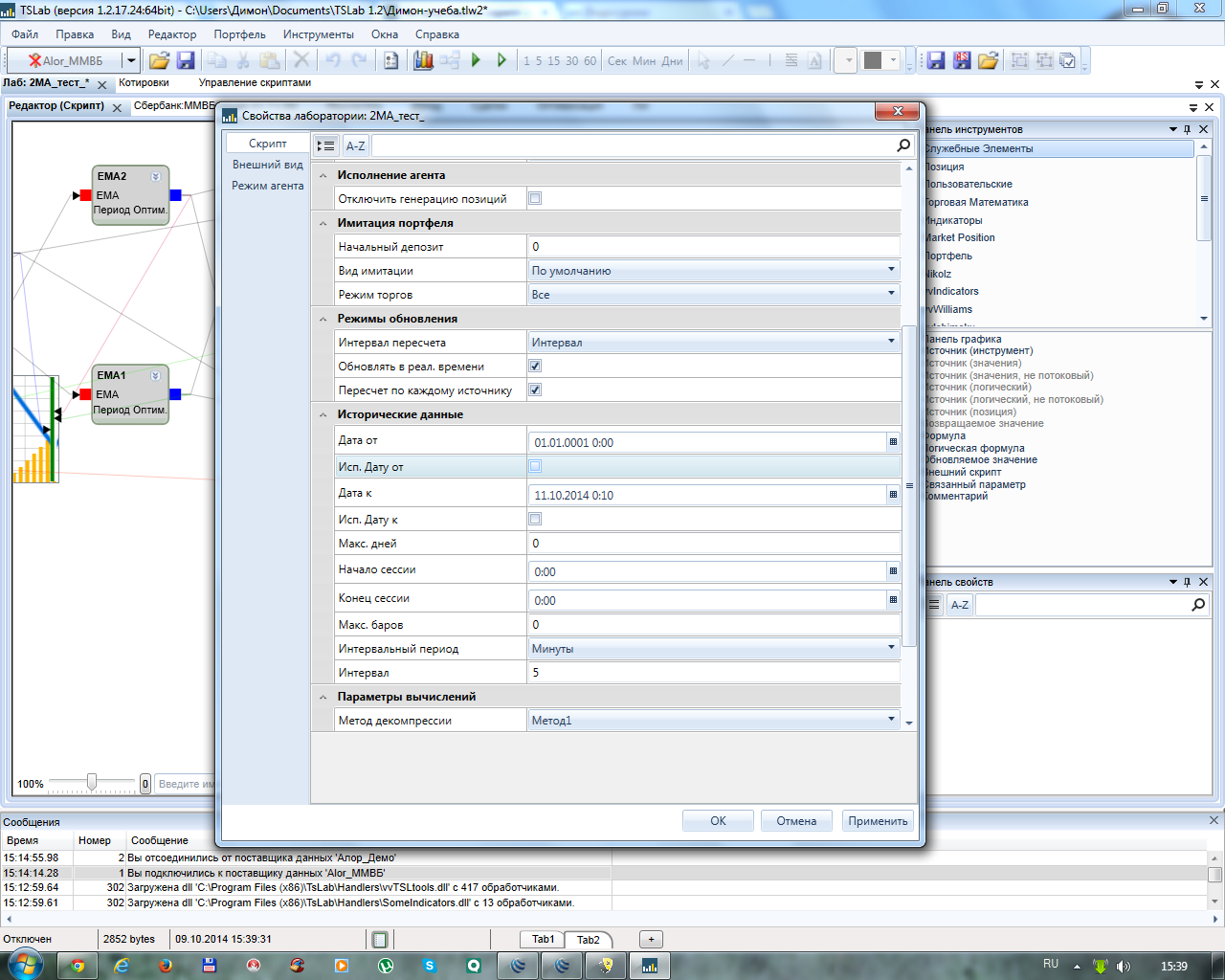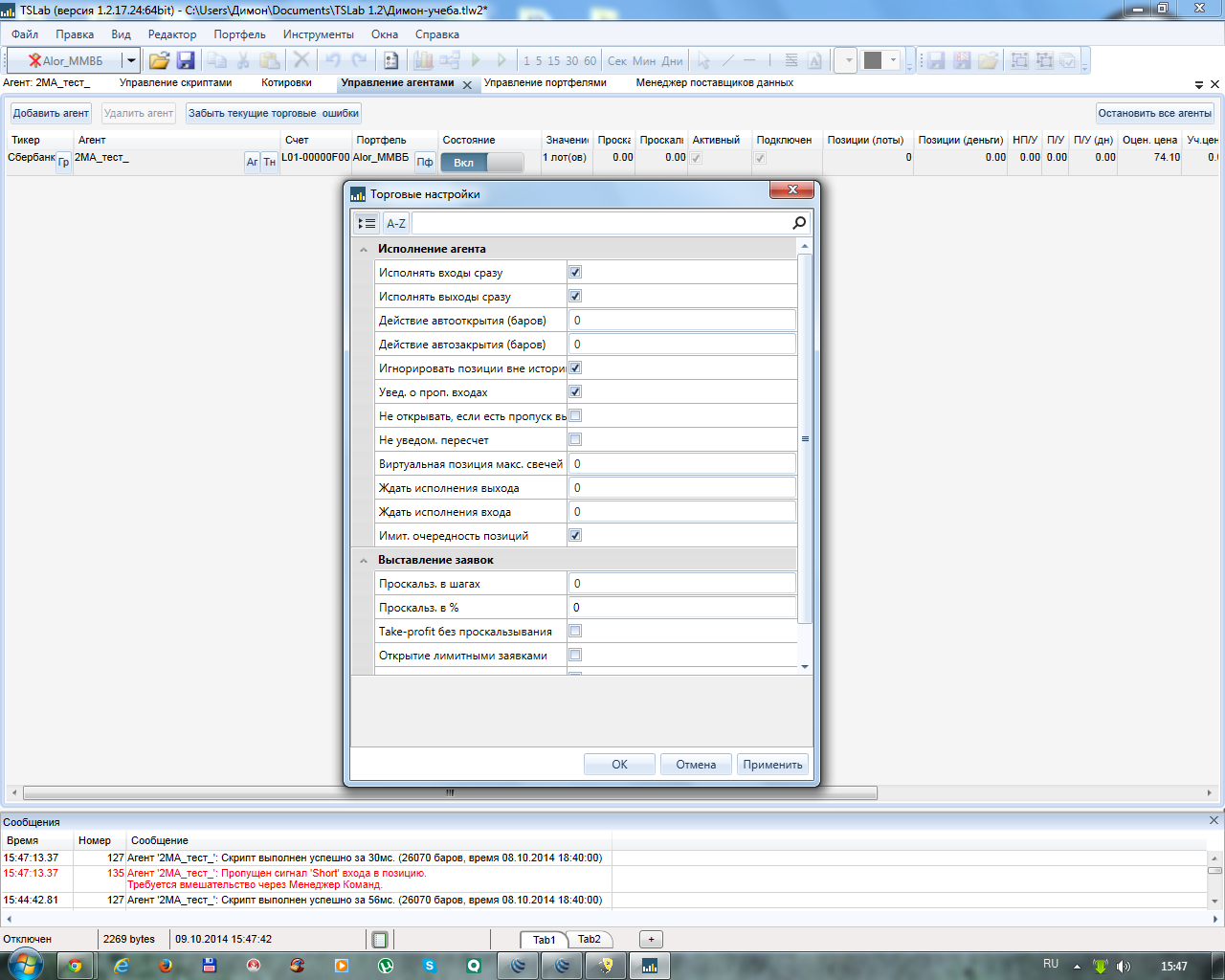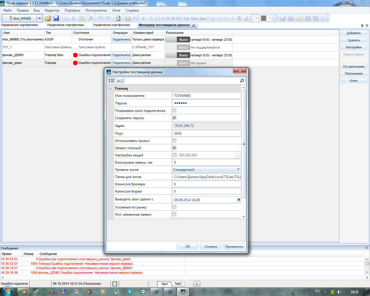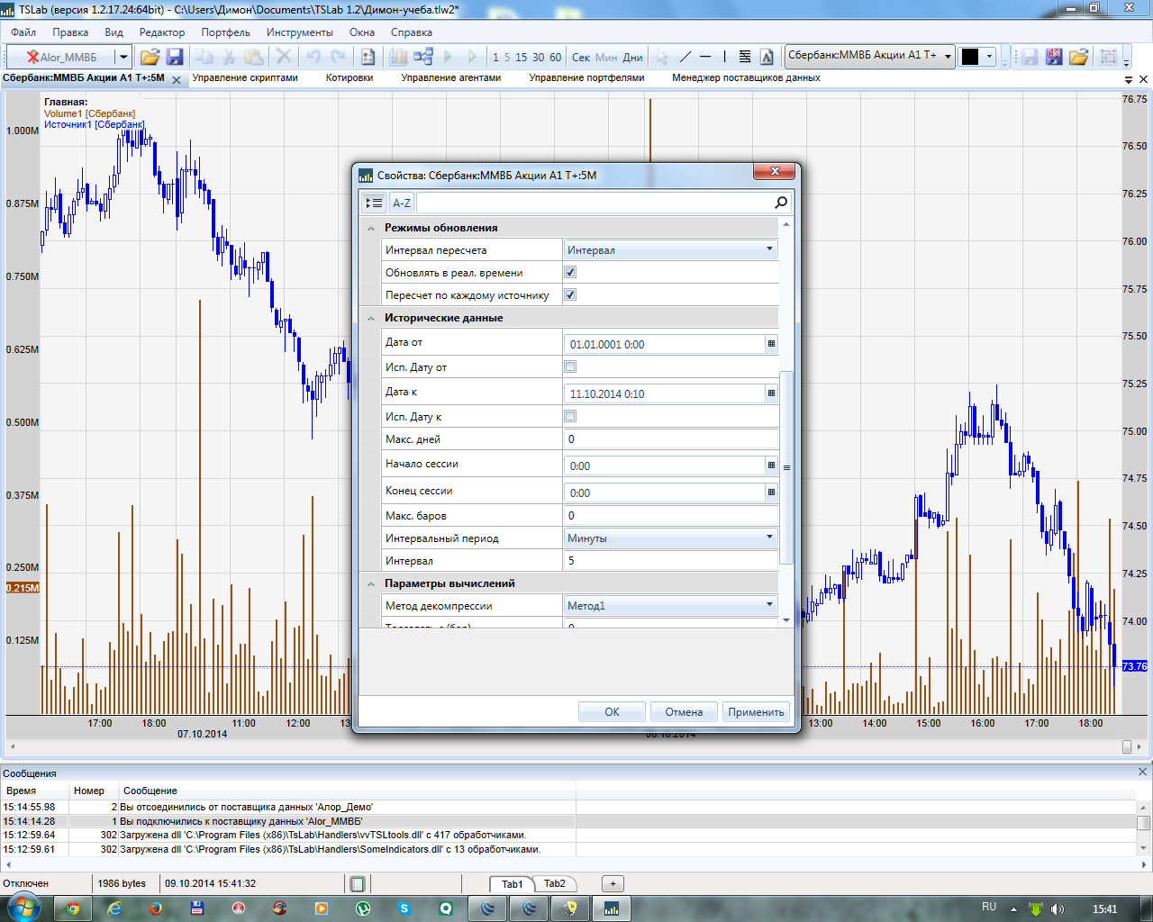Добрый день! Вот пробую демо торговлю на ММВБ. При запуске скрипта в работу возникло пару проблем: 1 Не запускается скрипт на торговлю, пишет в окне сообщений что что скрипт выполнен за n мс и в скобках время вчерашнего закрытия сессии. Открываю график там тоже самое показывает все до закрытия вчерашней сессии. График не обновляется, хотя поставлена галочка обновл в режиме реального времени. Пробовал без скрипта запустить любой др график тоже самое. Остальное все работает, то есть подключение работает корректно, котировки активны, стакан работает корректно, цены меняются, то есть все поступает от сервера норм. Подскажите что необходимо сделать, такое чувство где то нужно какие то галочки в свойствах поставить а где все уже перерыл, буду очень благодарен)