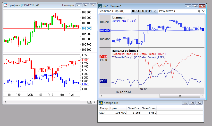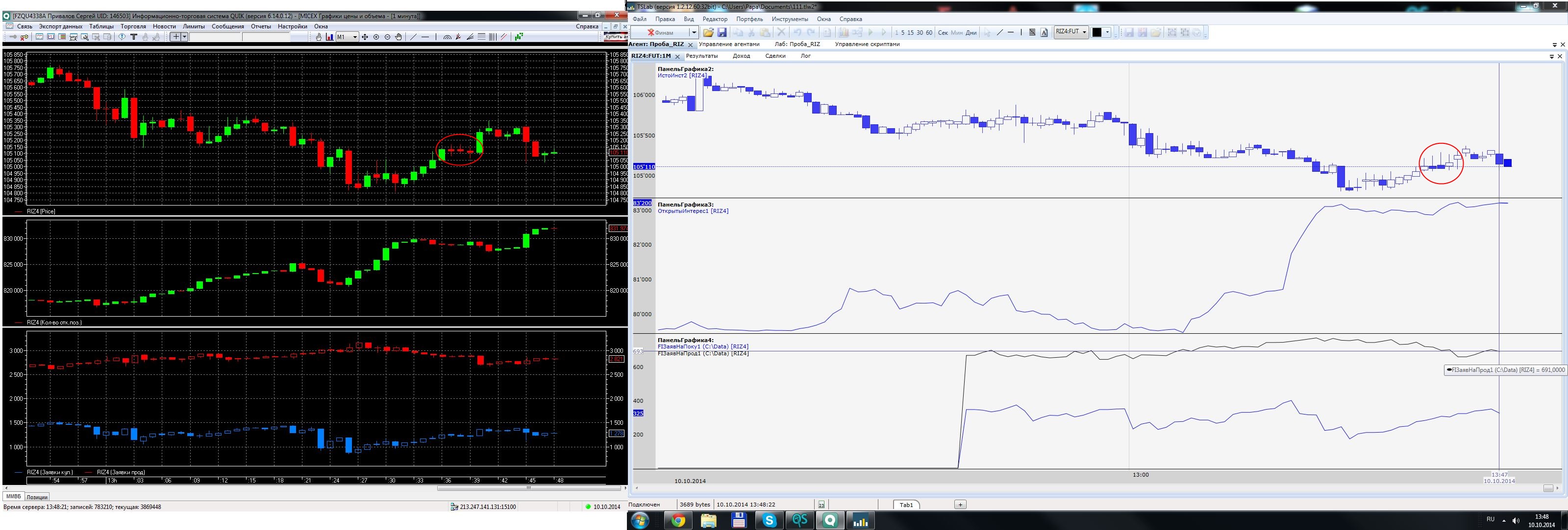 2. Сравнивайте с таблицей в окне "Котировки" (из меню файл). Если и там такие же цифры (с поправкой на частоту обновления), то проблема, либо со связью, либо с данными на сервере брокера. Финамовские сервера, в последнее время, работают с напрягом, возможно в этом причина расхождения. (Названия праметров все-же пишите точно, в Квике, например, это "Количество заявок на покупку" и т.п., в догадках можно и ошибиться). Также, обратите внимание, у Вас на скрине даже ценовые графики свечей не соответствуют друг-другу, наверняка, проблема таже самая.