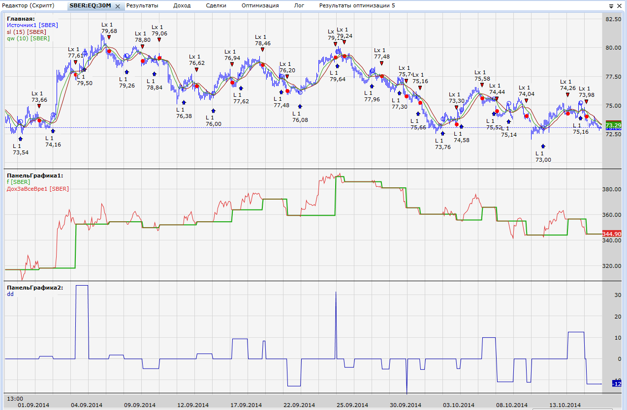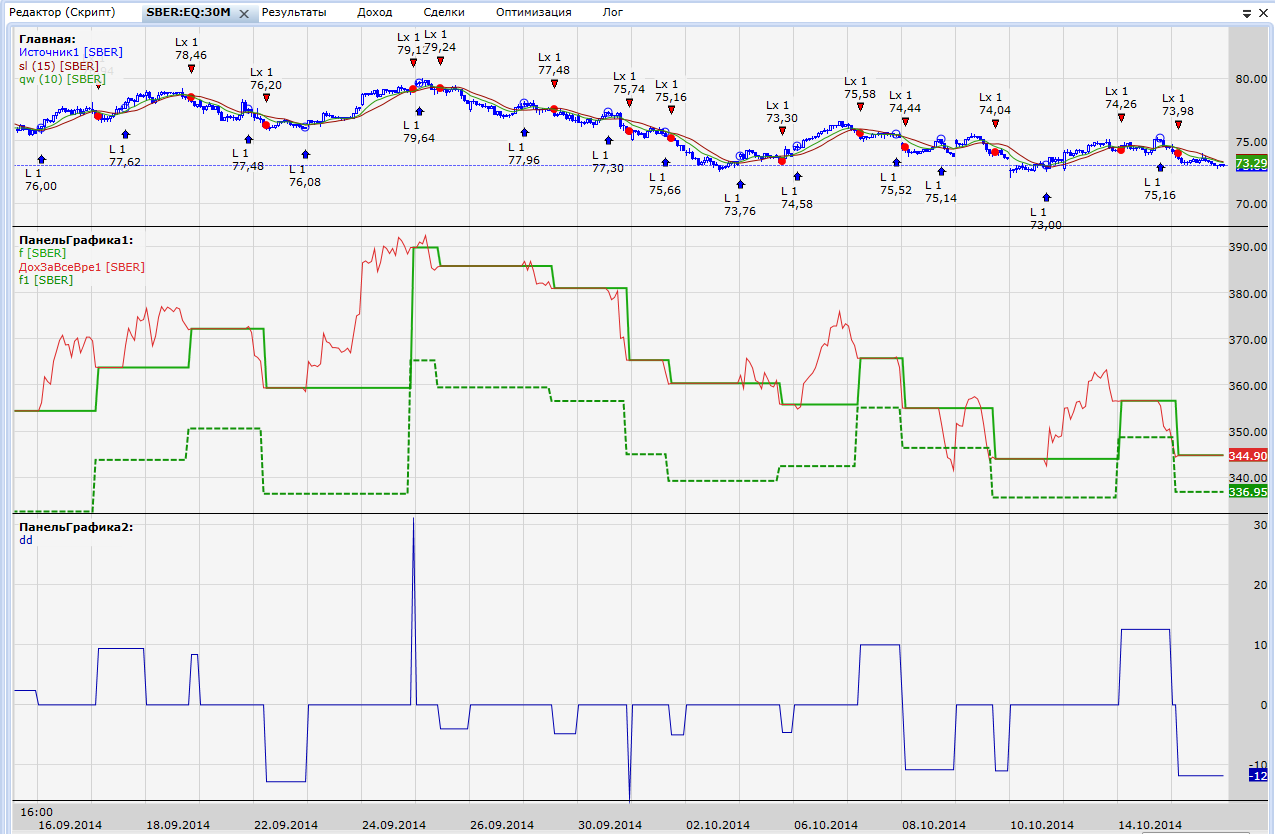 Хорошо буду разбираться с логикой скрипта. Ещё подскажите, как можно разделить виртуальные и реальные позиции в одном скрипте, в режиме реальных торгов? Может как вариант, по виртуальным позициям сделать индикатор и вставить его в скрипт реально торгующий, как сигнал для входа в позицию? Добавил Вам и виртуальную позицию и виртуальный доход по ней (зелёная прерывистая линия). Естественно он отличается от реального дохода из за условной цены входа. Подходит только для условных заявок (выходы по стоплоссу и тейкпрофиту к виртуальной позиции не прицепишь, виртуальные входы лимитками можно попробовать сделать, но это уже сами, т.к. я сомневаюсь в их соответствие с реальными). Доход по виртуальным позициям никак не будет влиять на реальный доход  Получается, что в скрипте три решения: 1. Доход по закрытым позициям за всё время 2. Доход по закрытым позициям за день 3. Доход по закрытым виртуальным позициям за всё время. Дерзайте  Если что интересно с этим придумаете, шепните мне на ушко З.Ы. Важно! Т.к. я делал примеры на акциях сбера, в формулах добавлено умножение на 10 (сбер торгуется по 10 шт. в лоте). Для других инструментов этот множитель надо убрать (фьючерсы) или изменить в соответствии с лотами на споте.