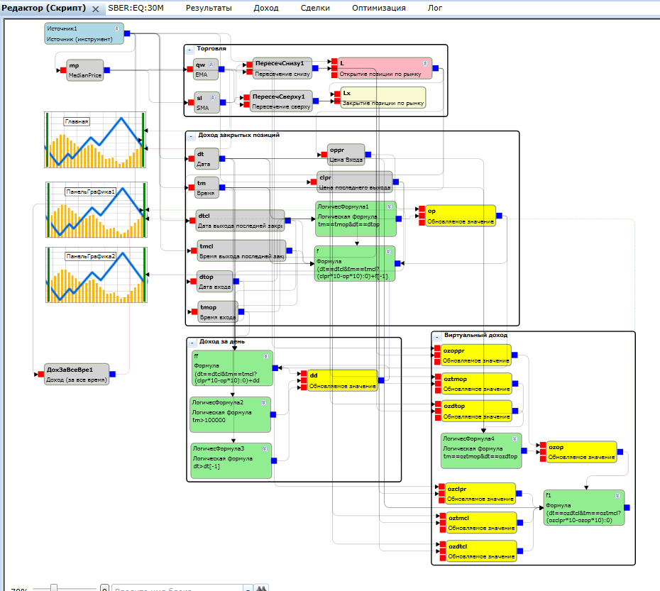 Несколько дней ломал голову как сделать индикатор или кубик чтобы подсчитывал прибыль или убыток за день по виртуальным сделкам, для того чтобы когда стротегия уходит в минус остонавливть торговлю, а когда выходит в плюс сново продолжать торговать по стратегии, может кто знает или видел на форуме подобные решения. Для торговли собственным эквити скрипта, необходимо считать доход/убыток только по закрытым позициям. При подсчёте дохода/убытка во время открытых позиций может возникать циклическая ссылка. Сделал пример для подсчёта профита закрытых позиций. И там же профит закрытых позиций за день (если сделка с переносом через ночь, то считает её от открытия). Немного громоздко, но при желании и необходимости можно самостоятельно сделать из этого кубик. Вообще же, блок (кубик) "доход за день" имеется в стандартном наборе версии 1.2 , но он отслеживает онлайн доход, а не доход закрытых позиций, что тоже (при некотором его использовании) может привести к циклической ссылке. Сделать тоже самое строго по виртуальным сделкам можно с помощью ОЗ по условиям входа и выхода. Но они (виртуальные сделки) не будут совпадать с реальными. В подобных случаях лучше торговать собственное эквити скрипта, чем пытаться генерить виртуальные позиции.