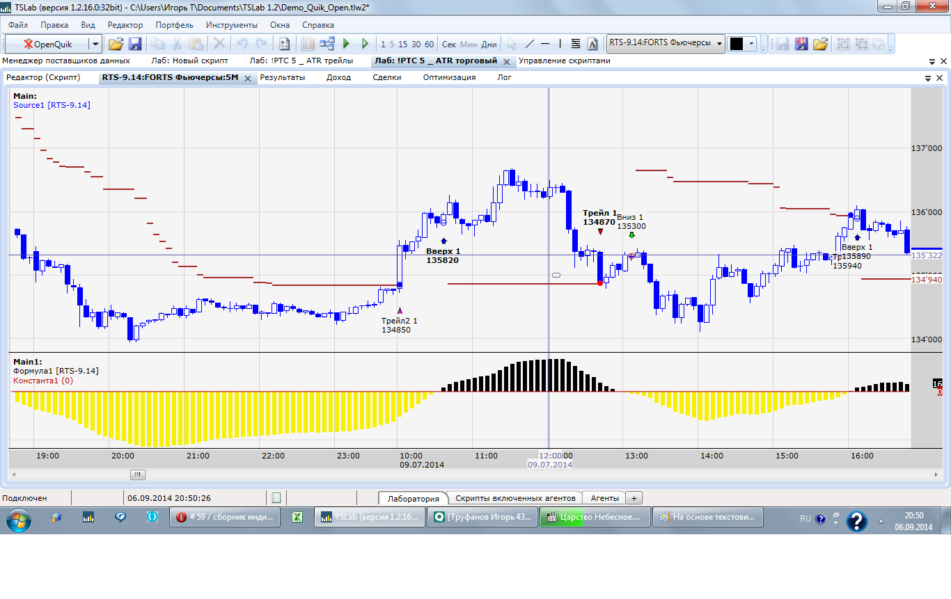 Доброго дня. Вито, по какой причине расчет ATRTrail может отличаться на текстовике и источнике от брокера? См. картинки в приложении. Естественно один и тот же скрипт, тот же период, отличаться только источники, во всяком случае я так думаю:) качество склейки скорее всего и причина От Финама полным куском, да и дело не во входящих данных - посмотри еще скрины - кубик, по какой-то причине просто не берет первоначальный стоп, а расчитывает трейл. Не спец конечно, но от входящих данных такое поведение зависить не должно...