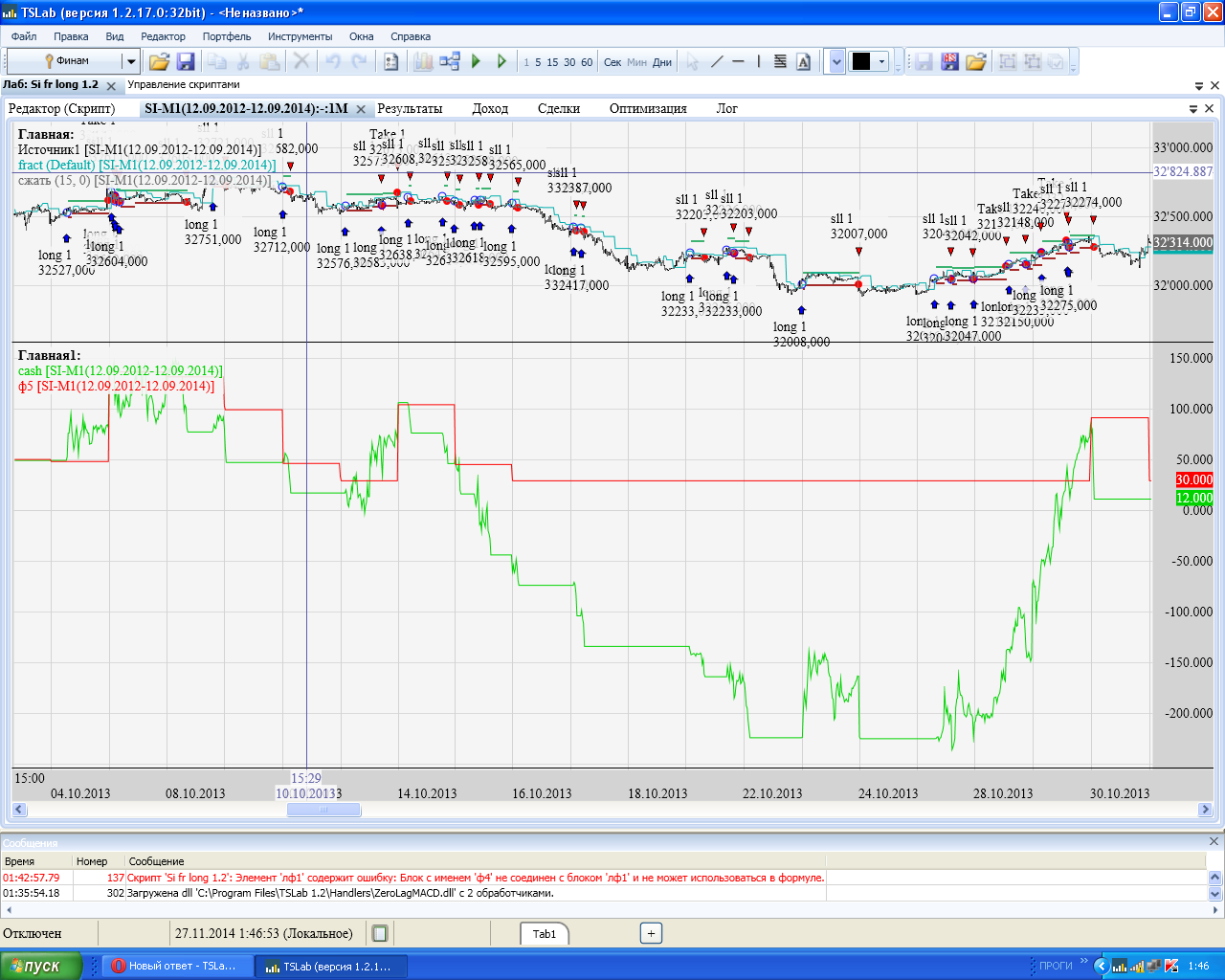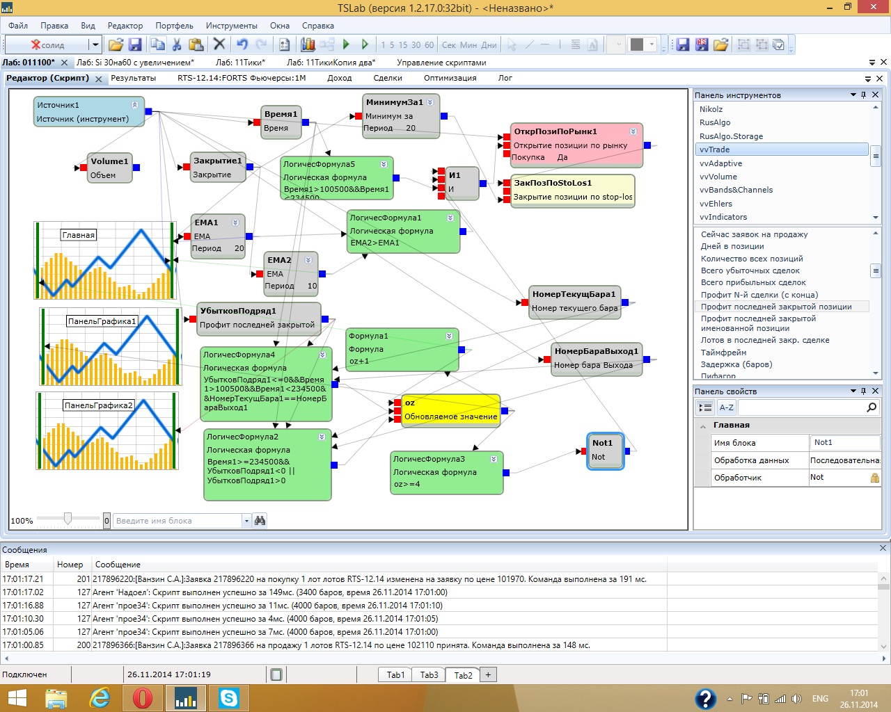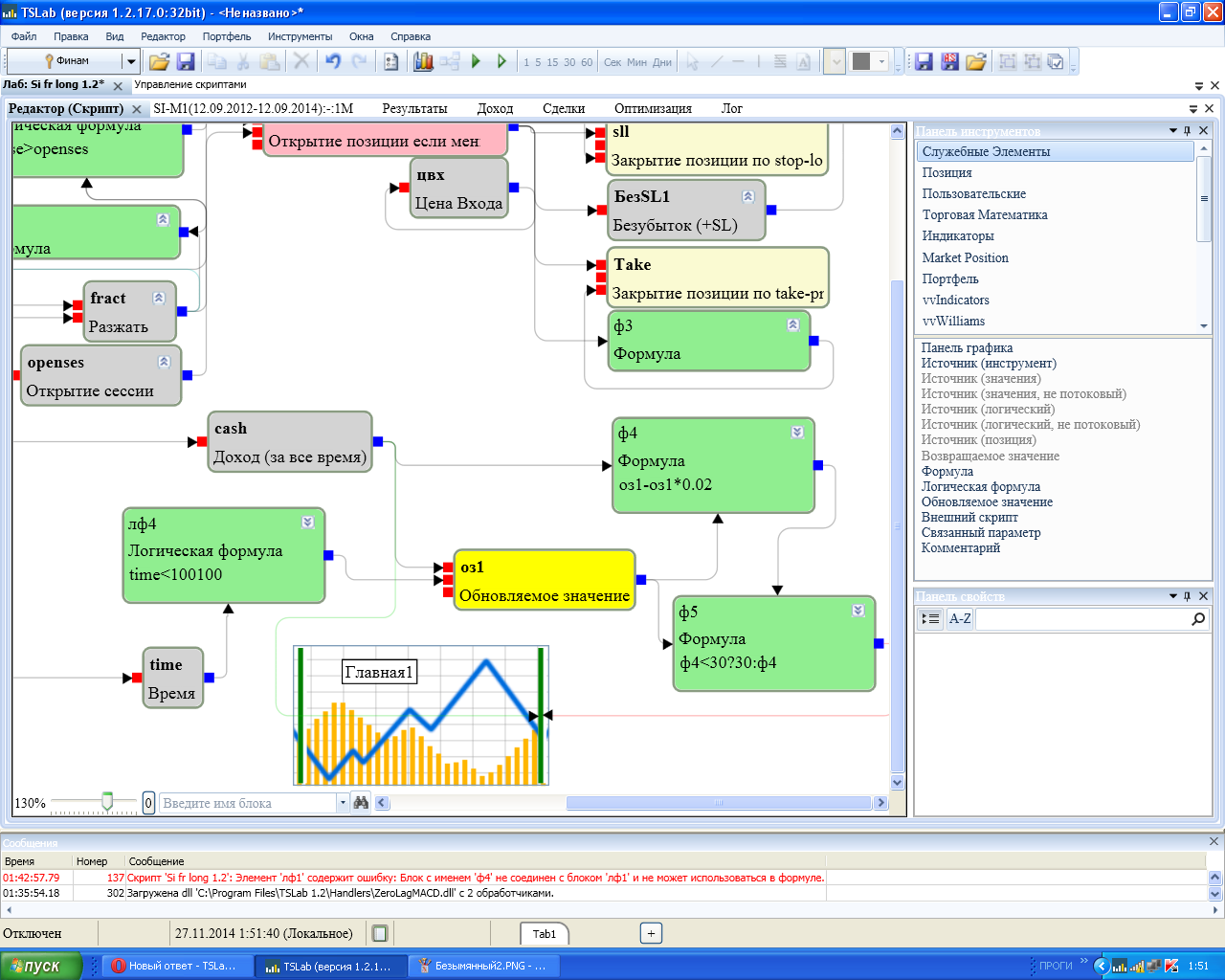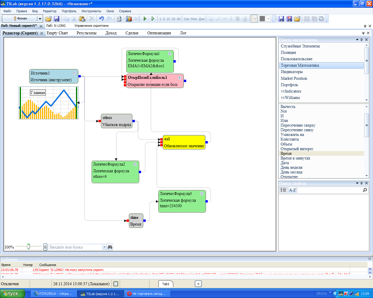 чтот я совсем не пойму.. вот у меня есть блок открытия позиции, который уже открывается при логическом условии, допустим, я куплю при EMA1>EMA2, но мне необходимо не допускать больше 4х убыточных сделок в день. я блок убыточных сделок подряд подаю на оз и в условии обновления пишу что убытков подряд<4, а на очистку подам условие что время>234500. таким образом мы будем иметь что оз будет выдавать добро до достижения 4х убытков подряд и очистится как только время будет>234500, но теперь куда и как втыкать оз? у меня какую - то ошибку выдает если я в условии открытия позиции пишу: EMA1>EMA2&&оз Скрин лови