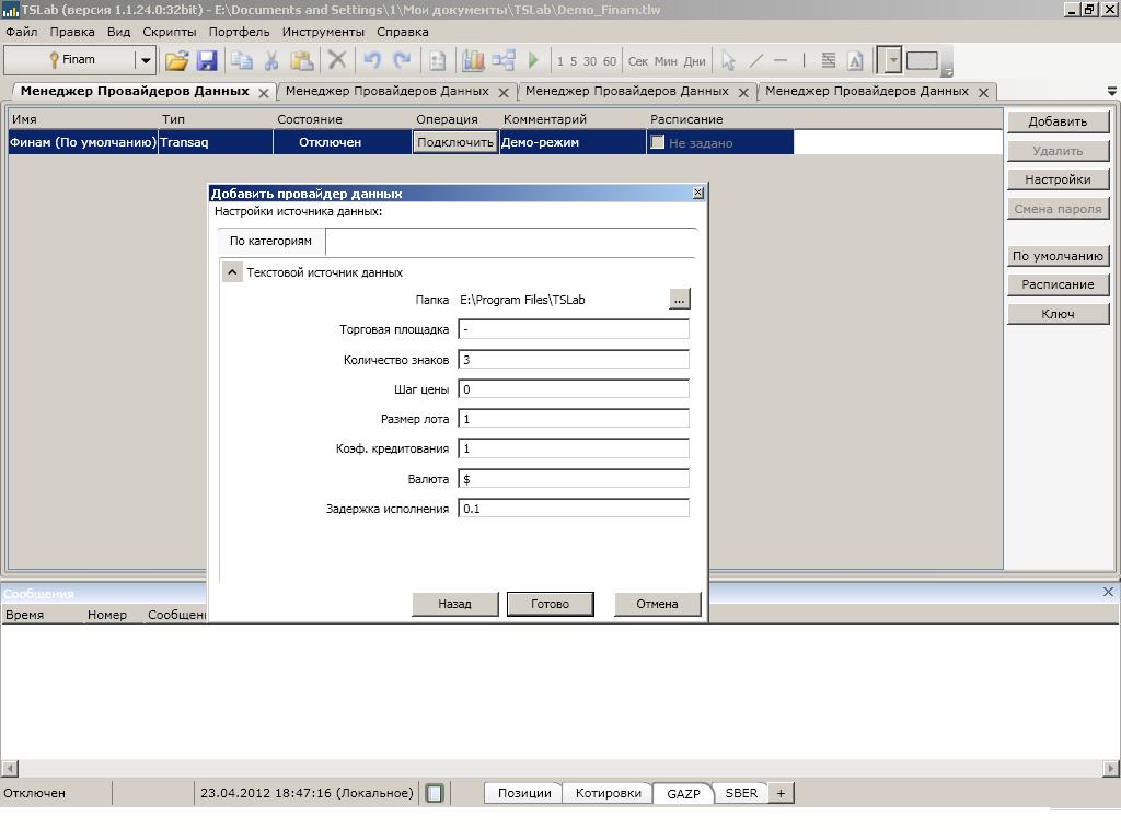 Поставил TSLab 1.1.24.0. Скачал с Финама данные в таком формате- <TICKER>,<PER>,<DATE>,<TIME>,<OPEN>,<HIGH>,<LOW>,<CLOSE> GAZP,60,20060421,100000,275.00000,276.70000,273.30000,275.45000 GAZP,60,20060421,110000,275.50000,276.68000,274.86000,275.31000 программа говорит "не поддерживается".И график не показывает.